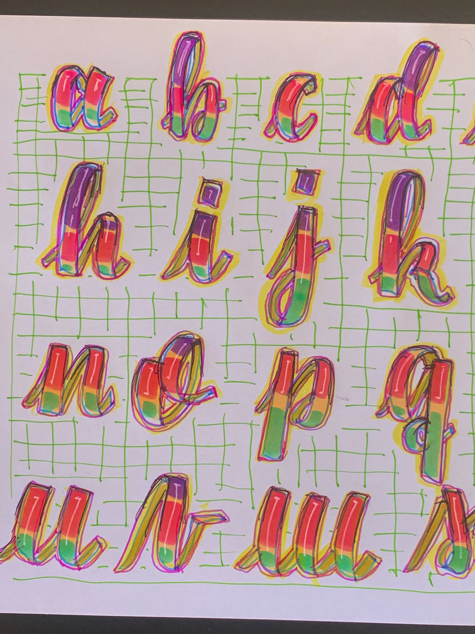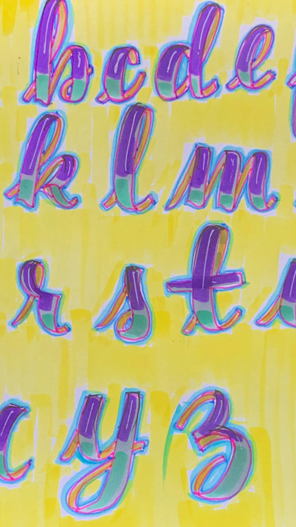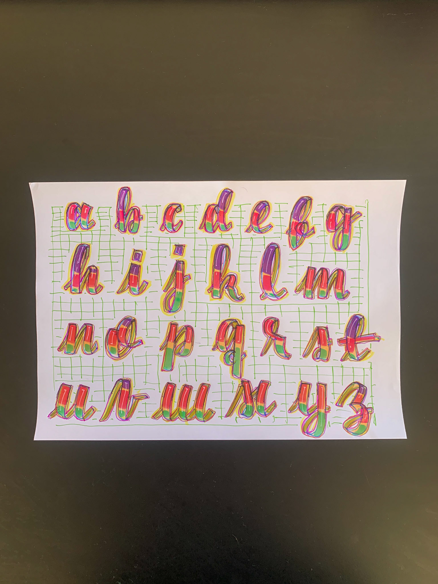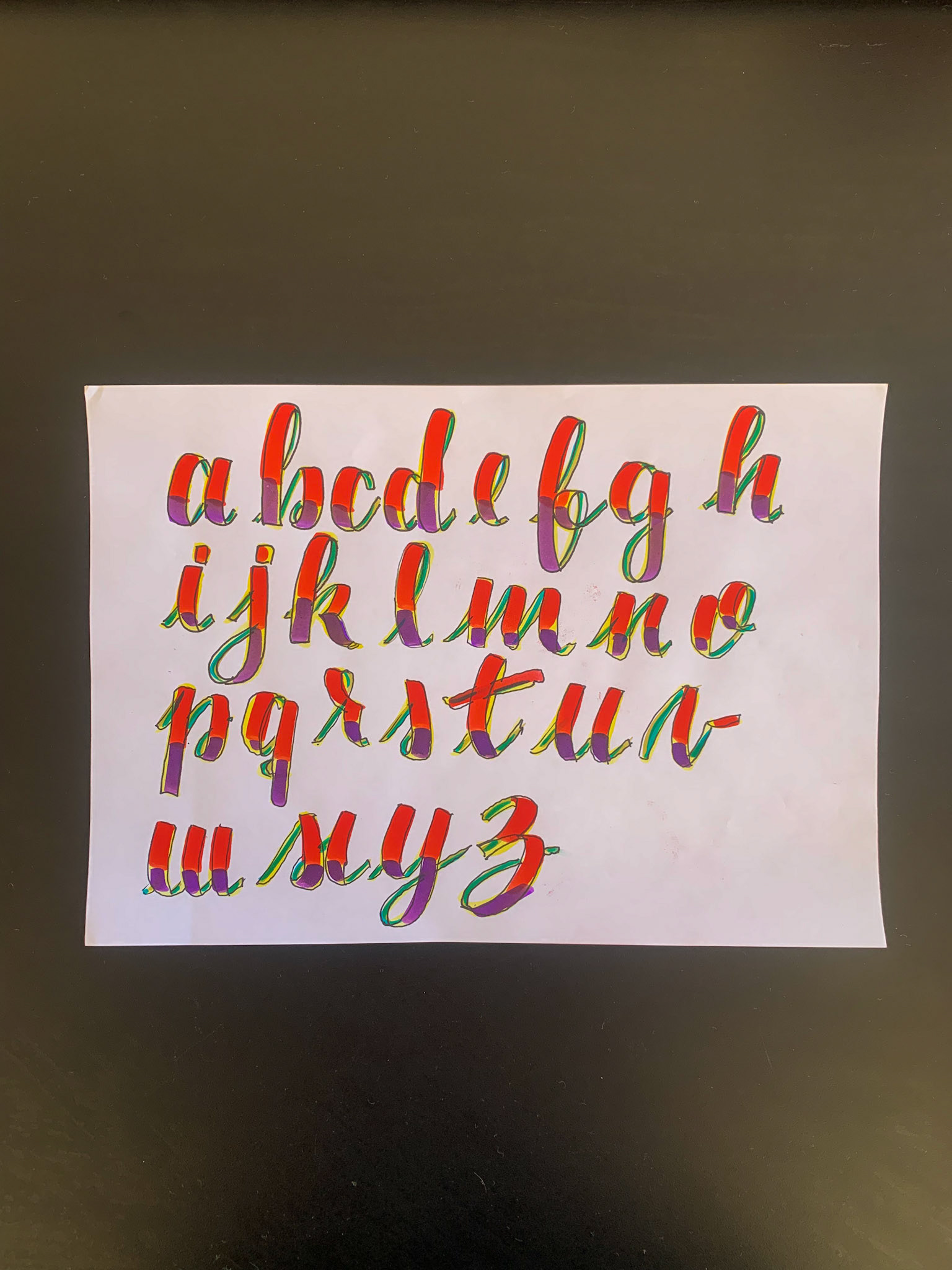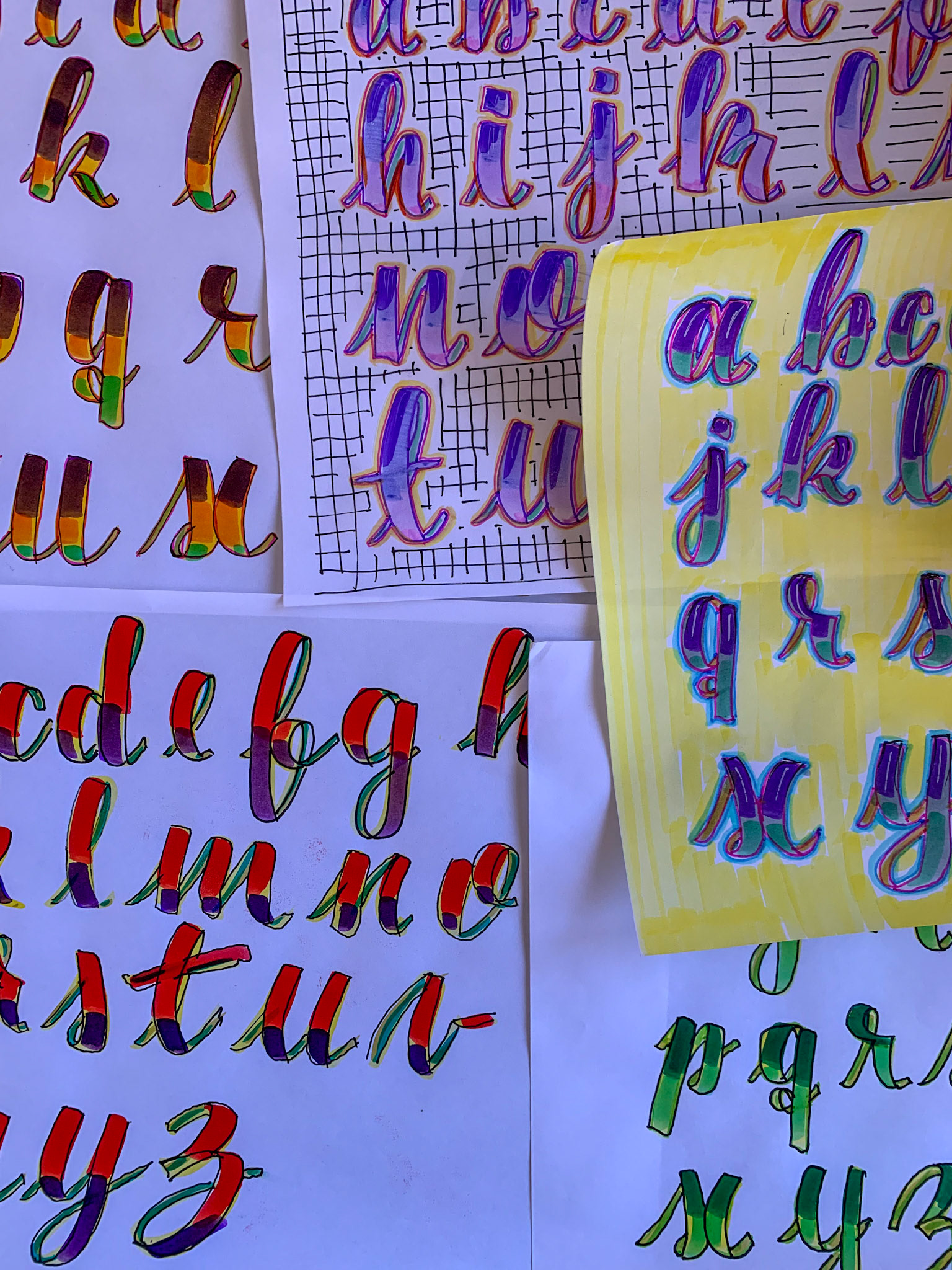 série de alfabetos em papel formato A4 feitos com canetas aquareláveis, canetas esferográficas gel e caneta nanquim