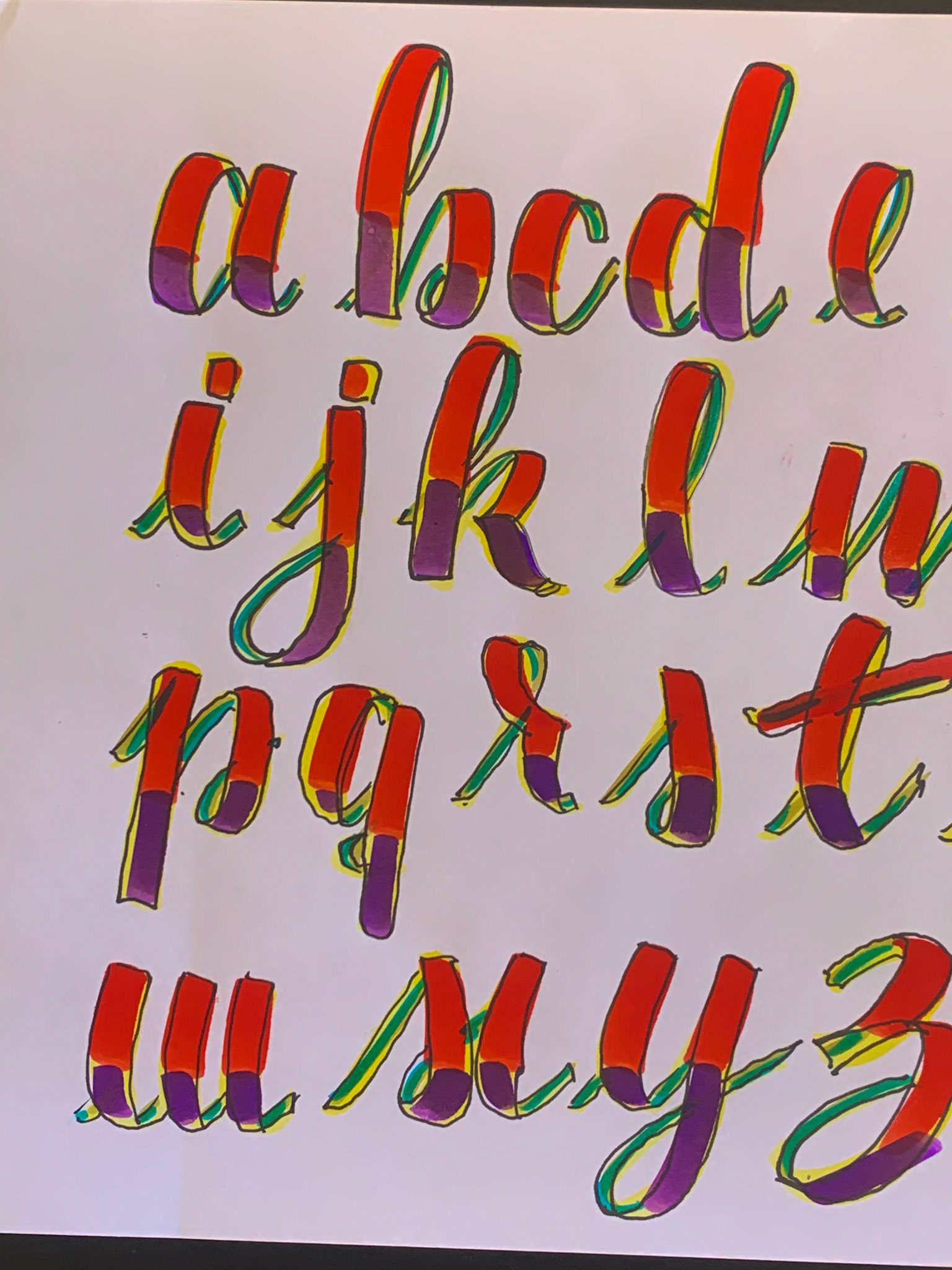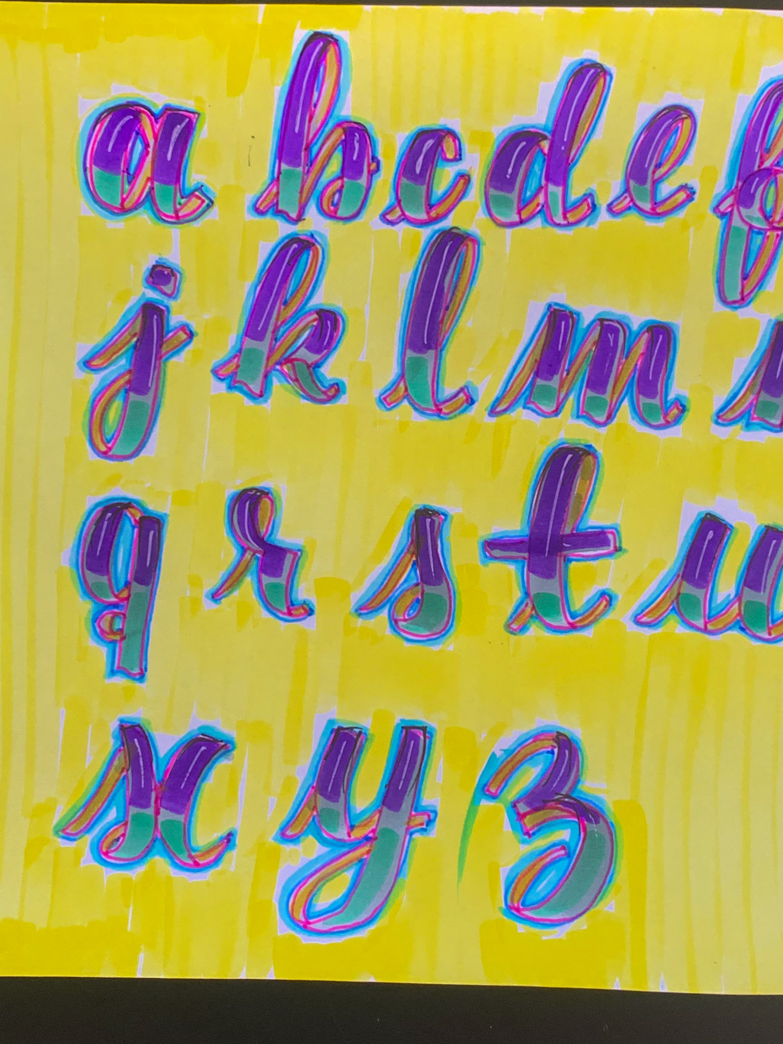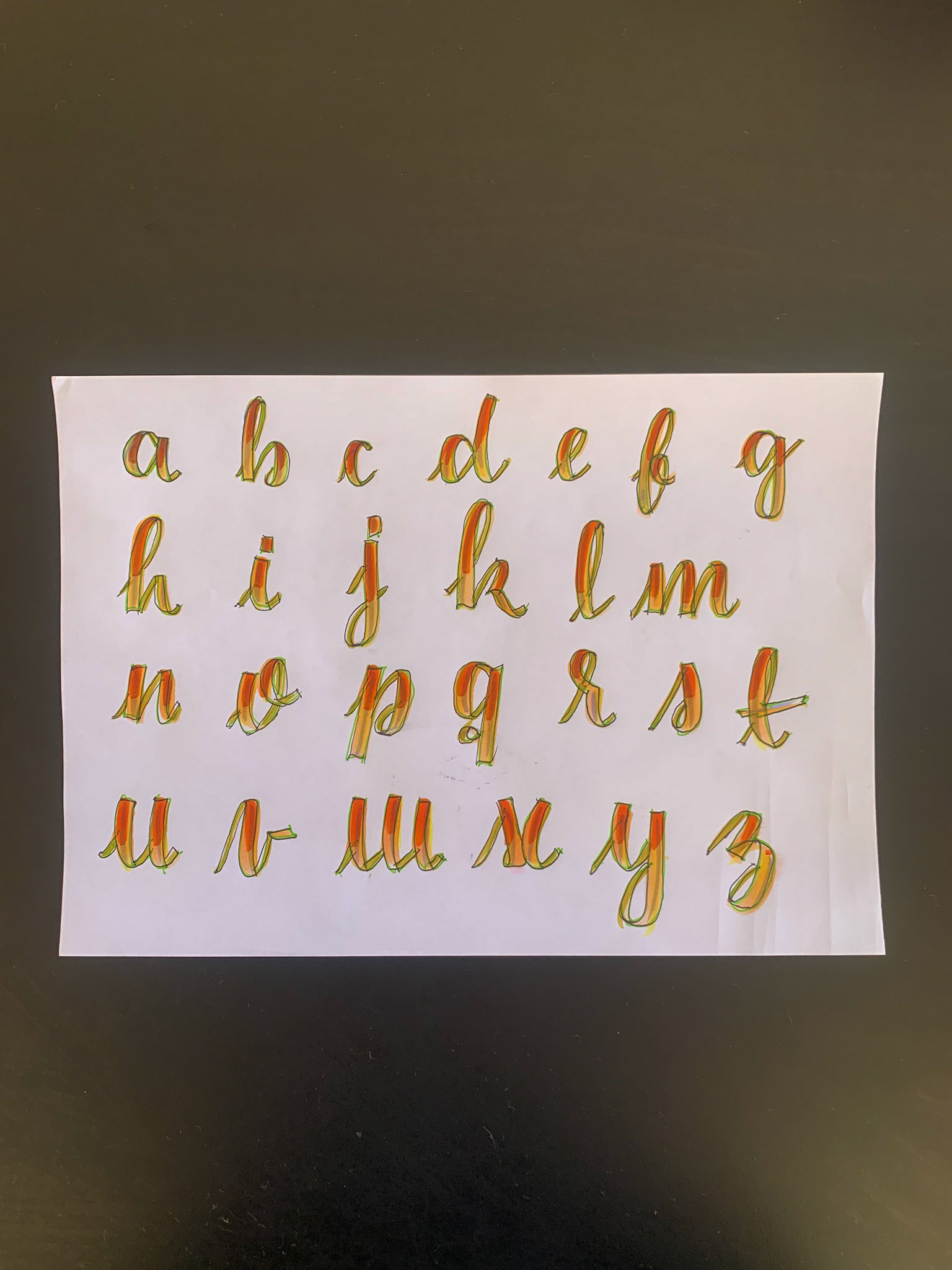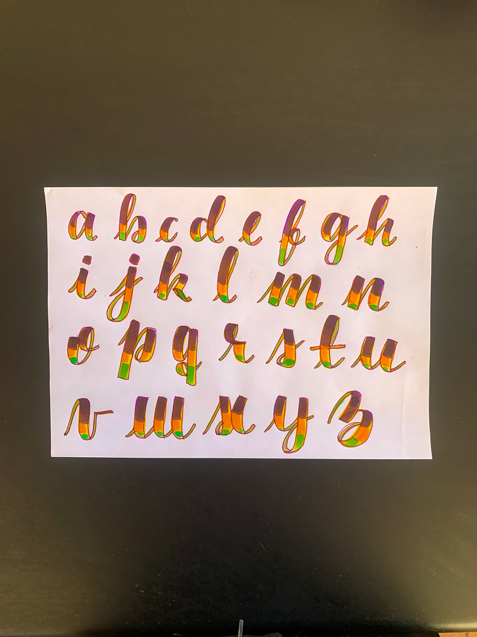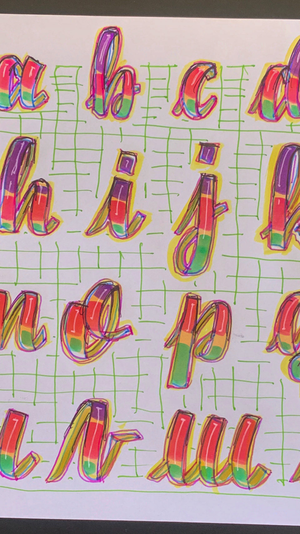 série de alfabetos em papel formato A4 feitos com canetas aquareláveis, canetas esferográficas gel e caneta nanquim