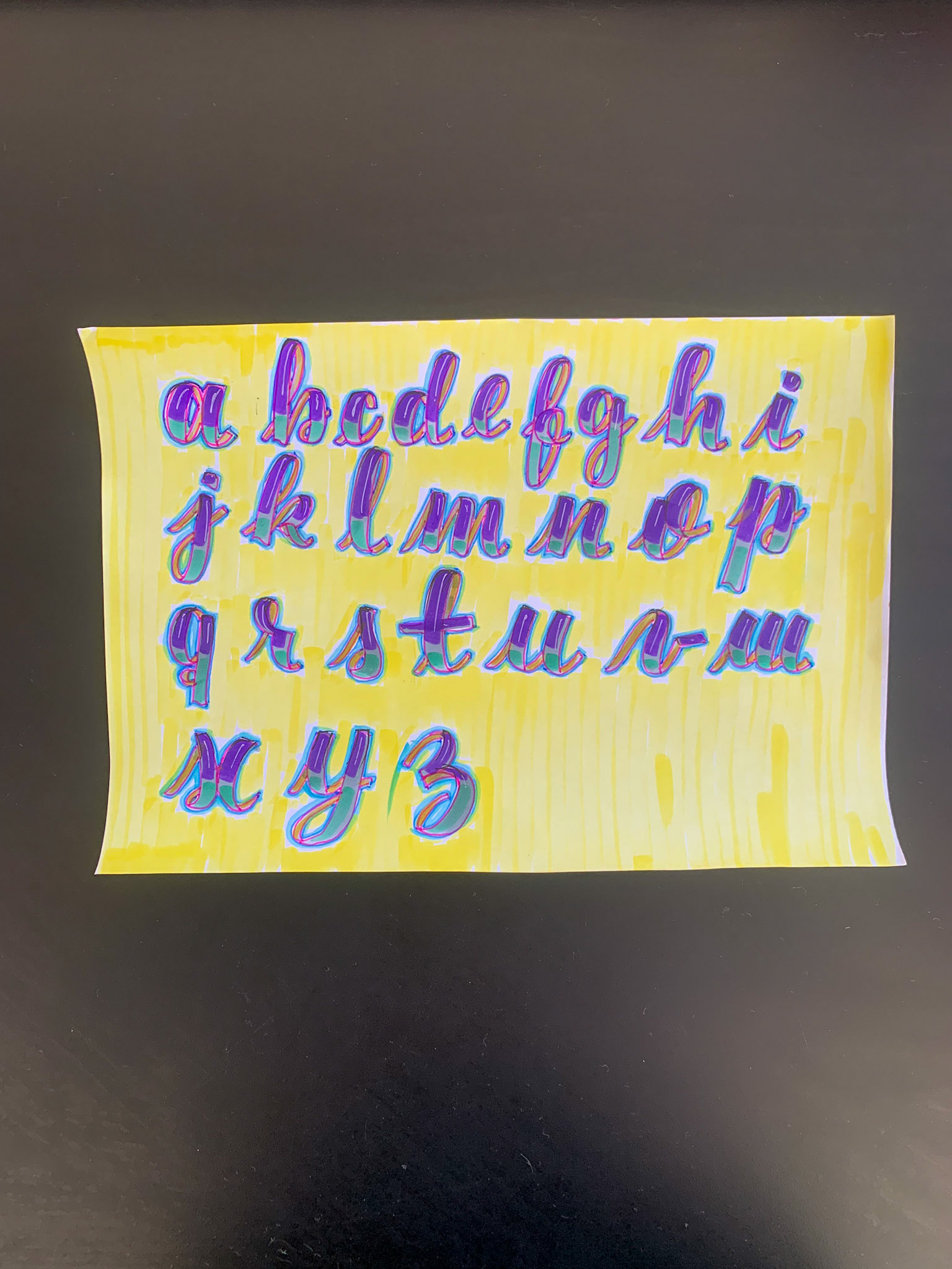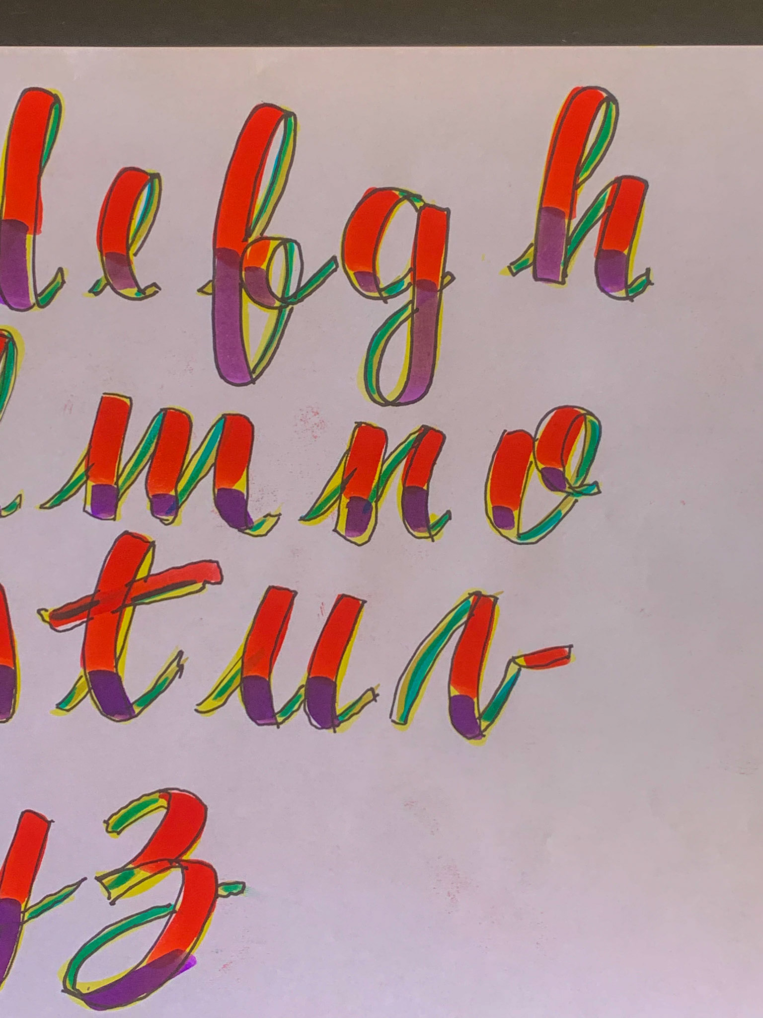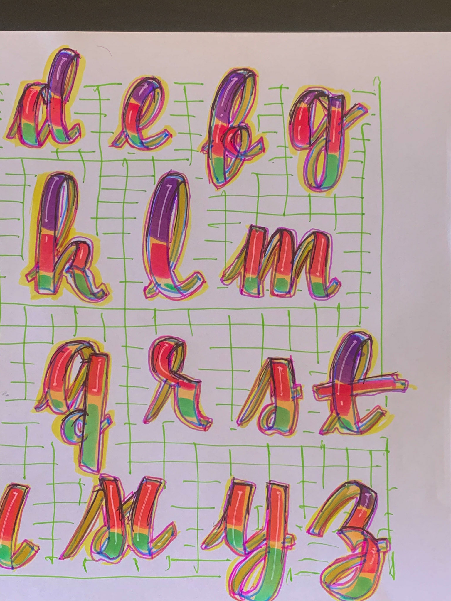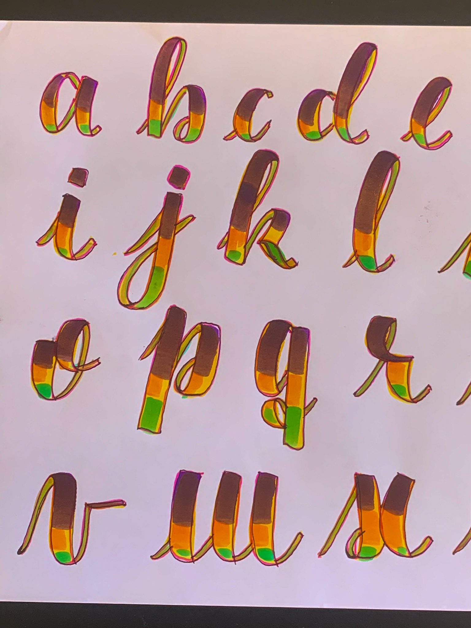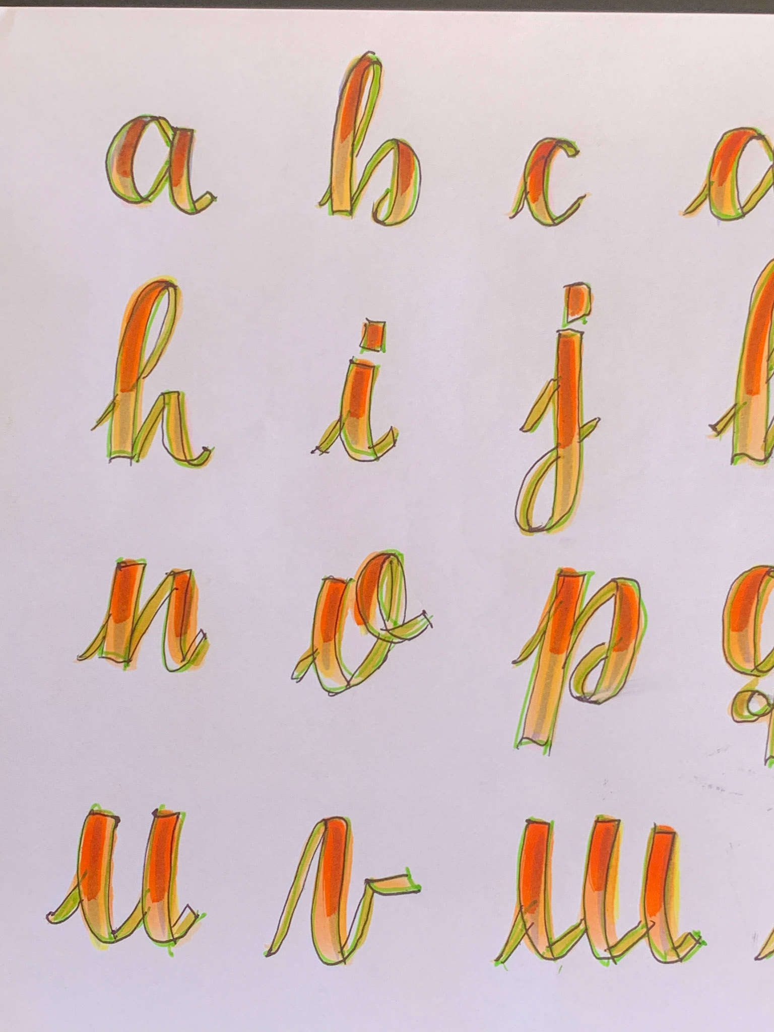 série de alfabetos em papel formato A4 feitos com canetas aquareláveis, canetas esferográficas gel e caneta nanquim