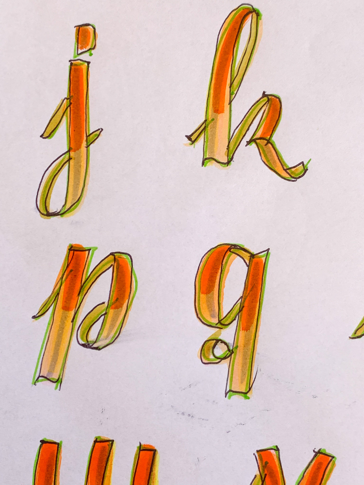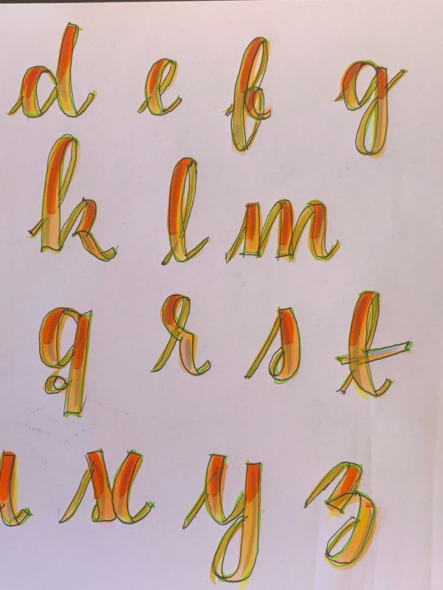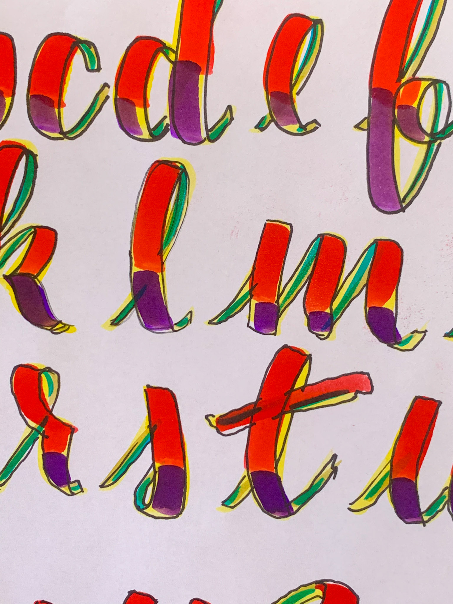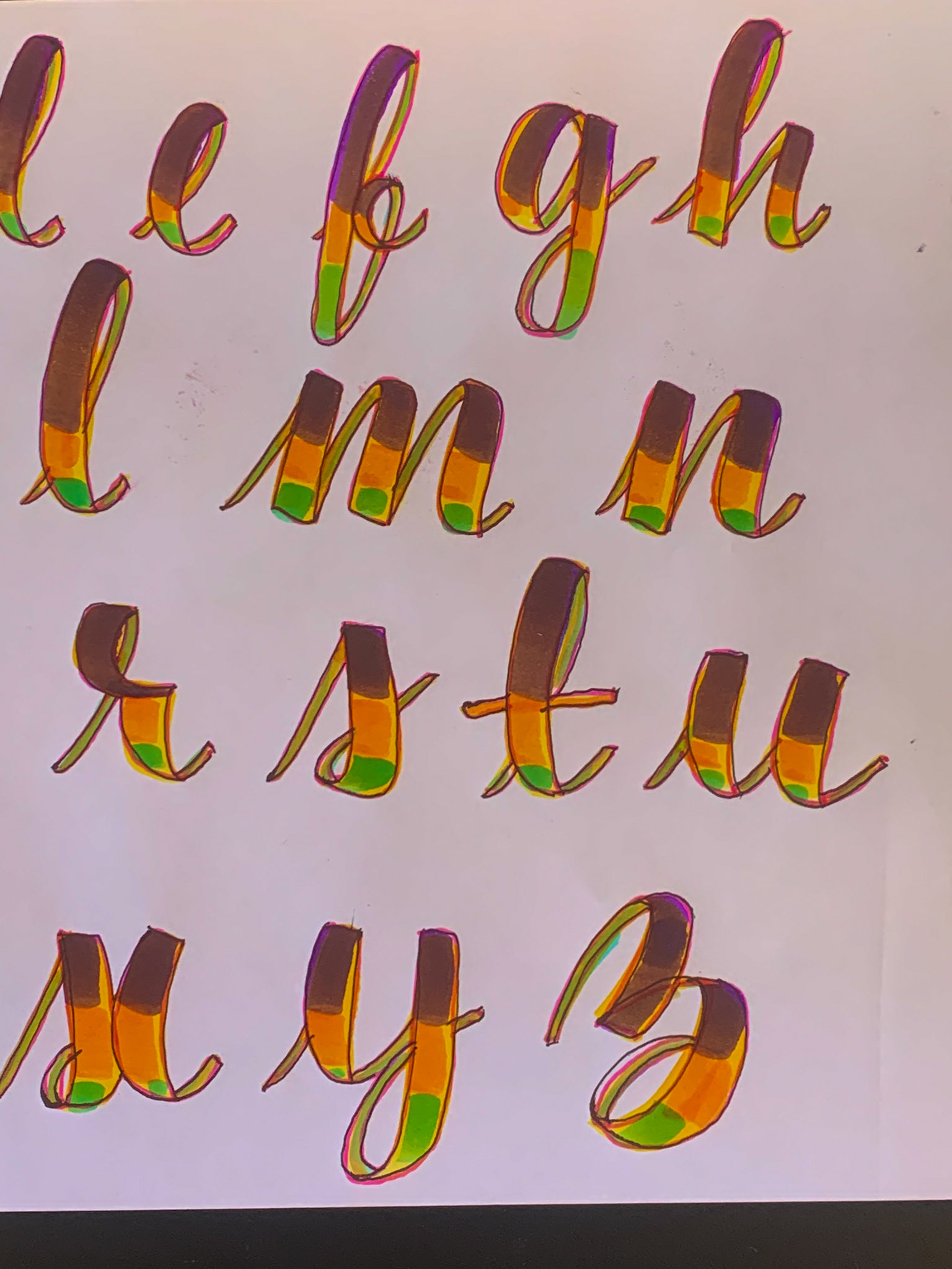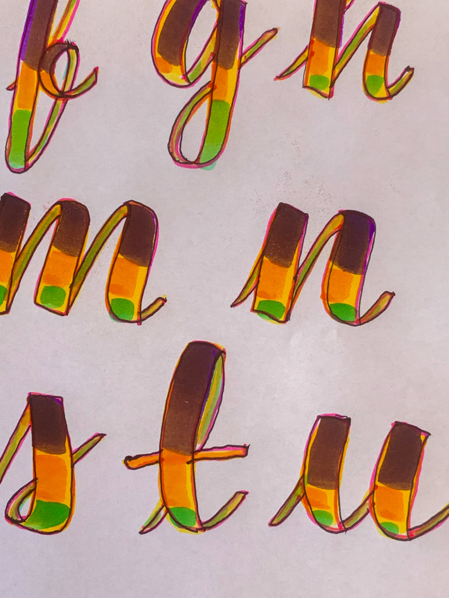 série de alfabetos em papel formato A4 feitos com canetas aquareláveis, canetas esferográficas gel e caneta nanquim