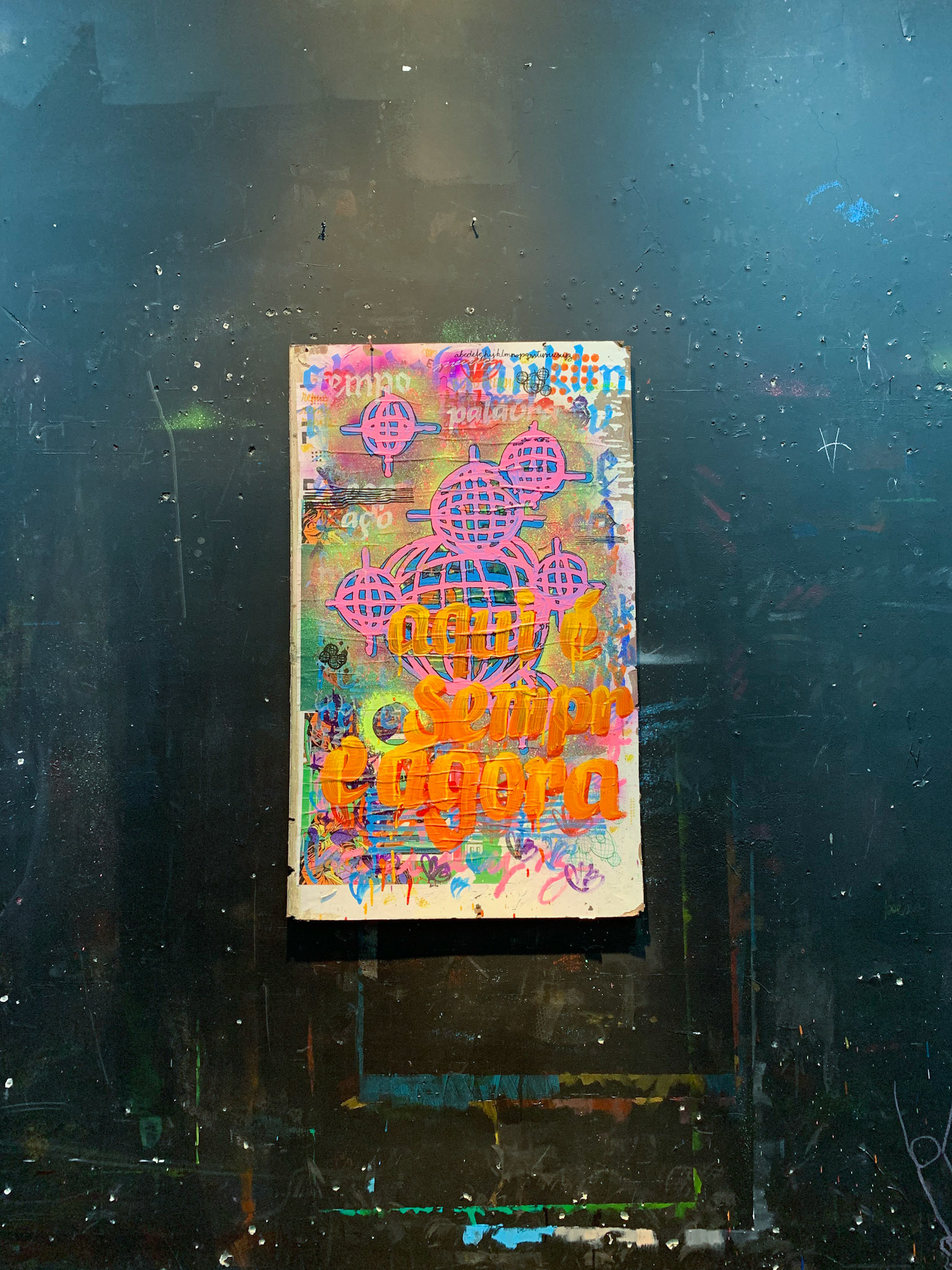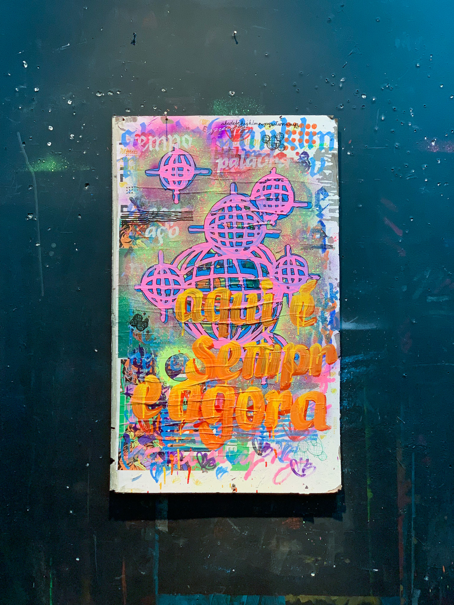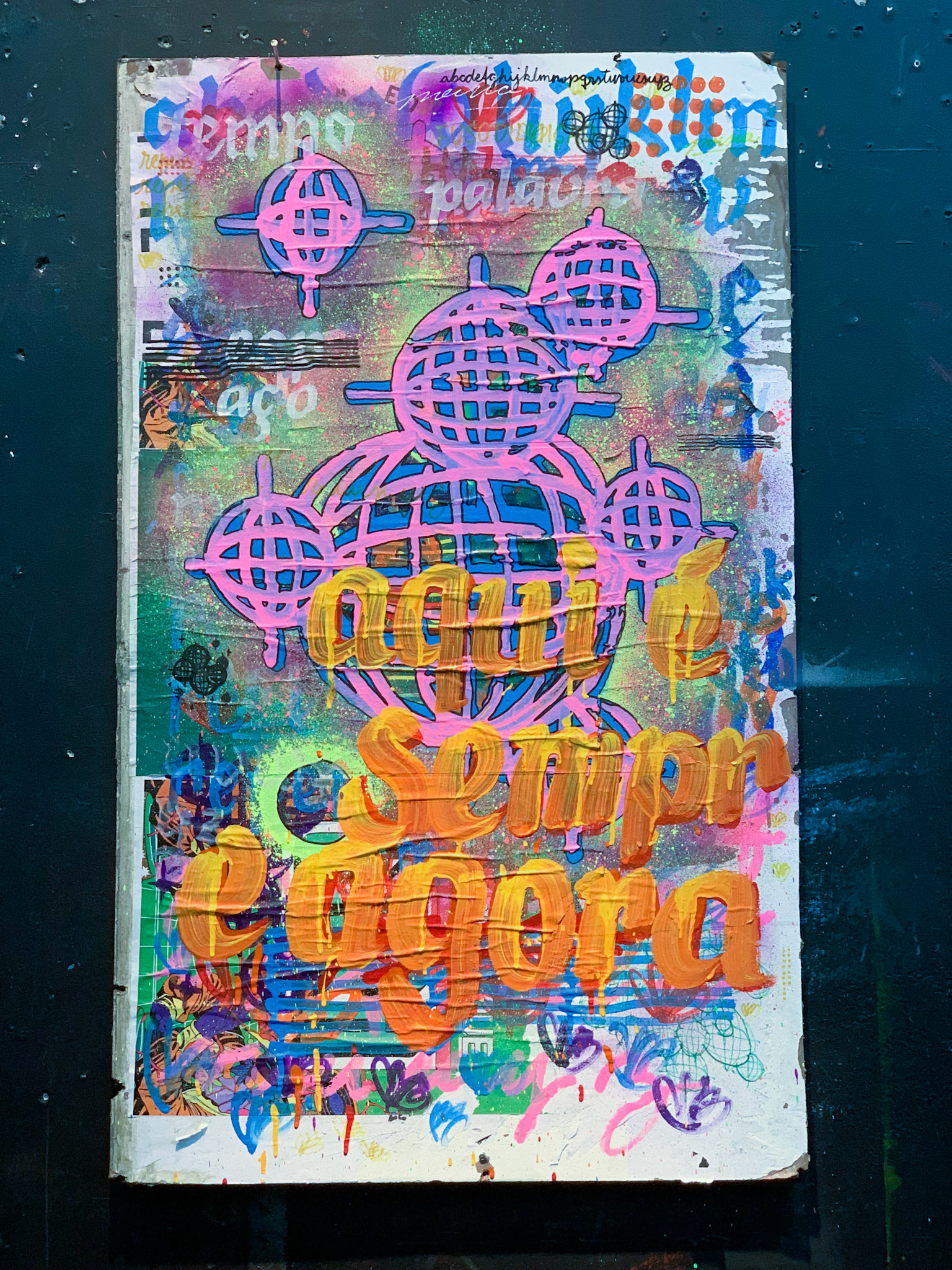 técnica: tinta serigráfica acrílica base água para tecido, spray, giz pastel, tinta de rua, tinta acrilica, grafite sobre eucatex - 63 x 104 cm