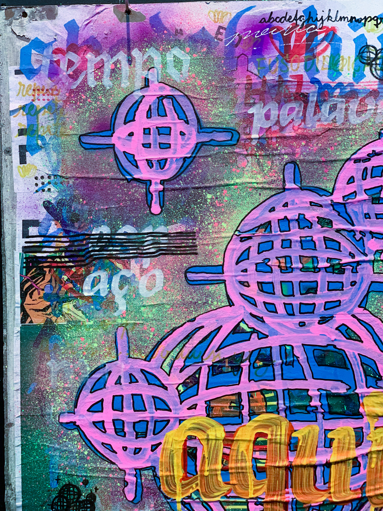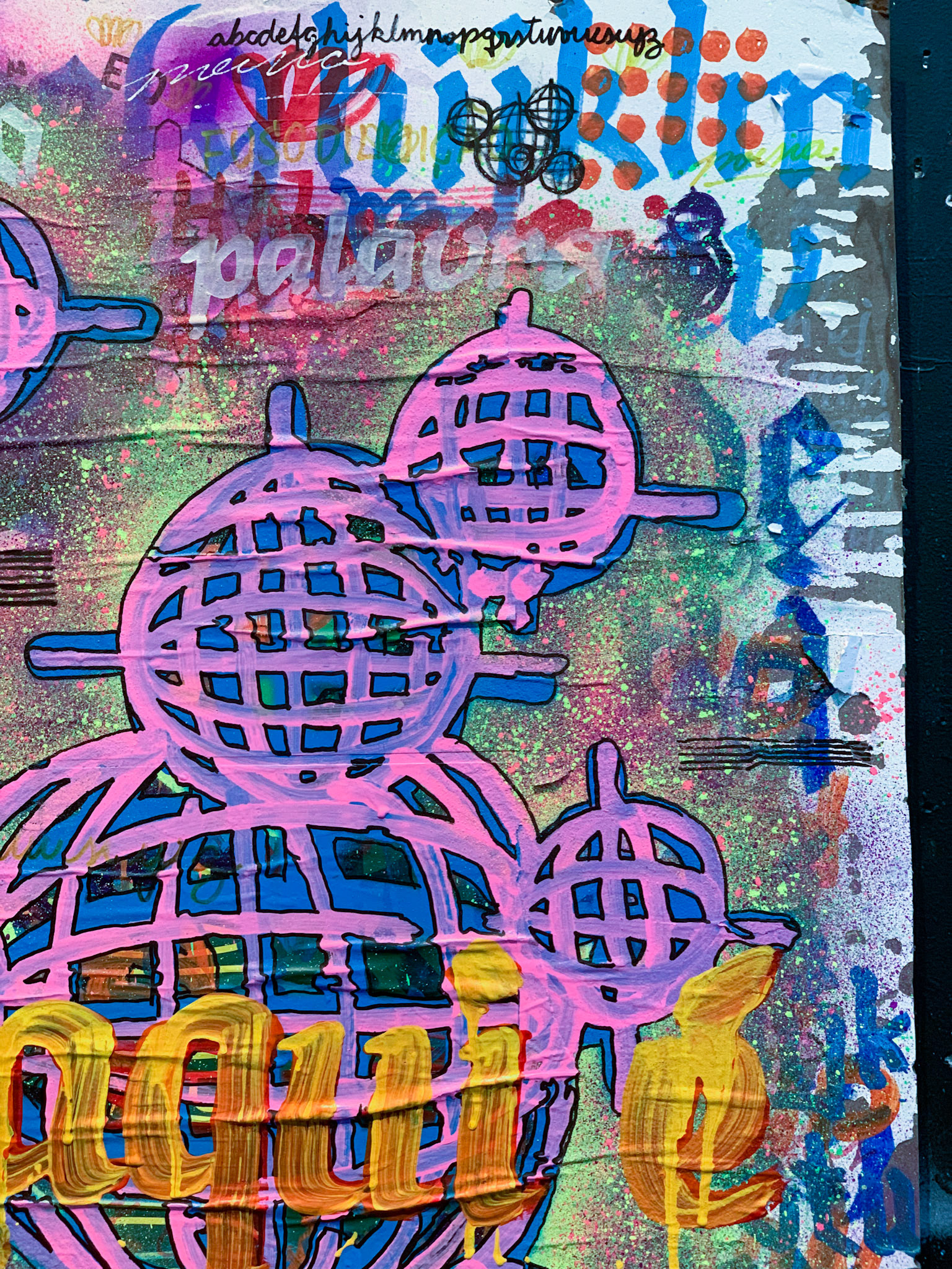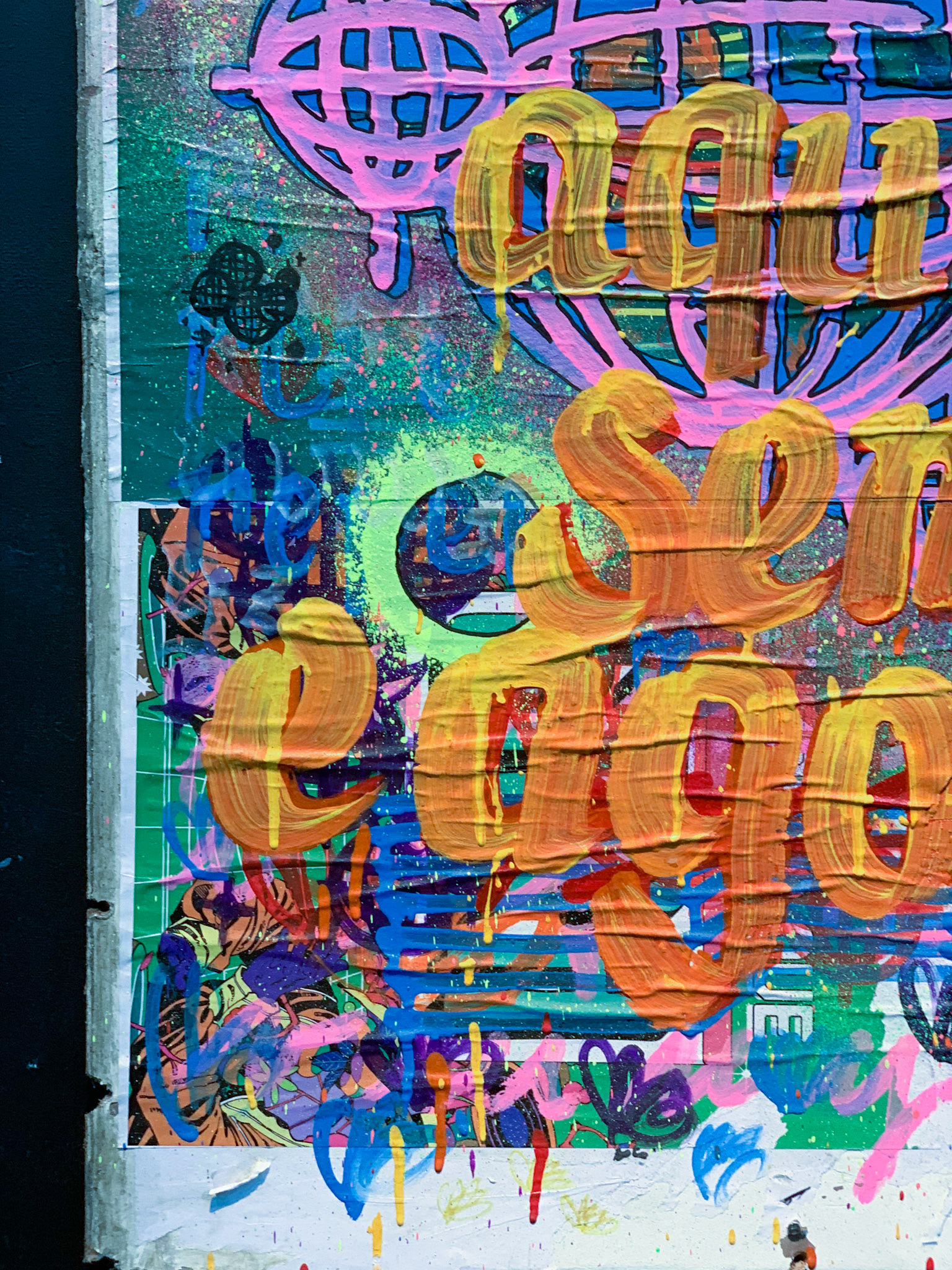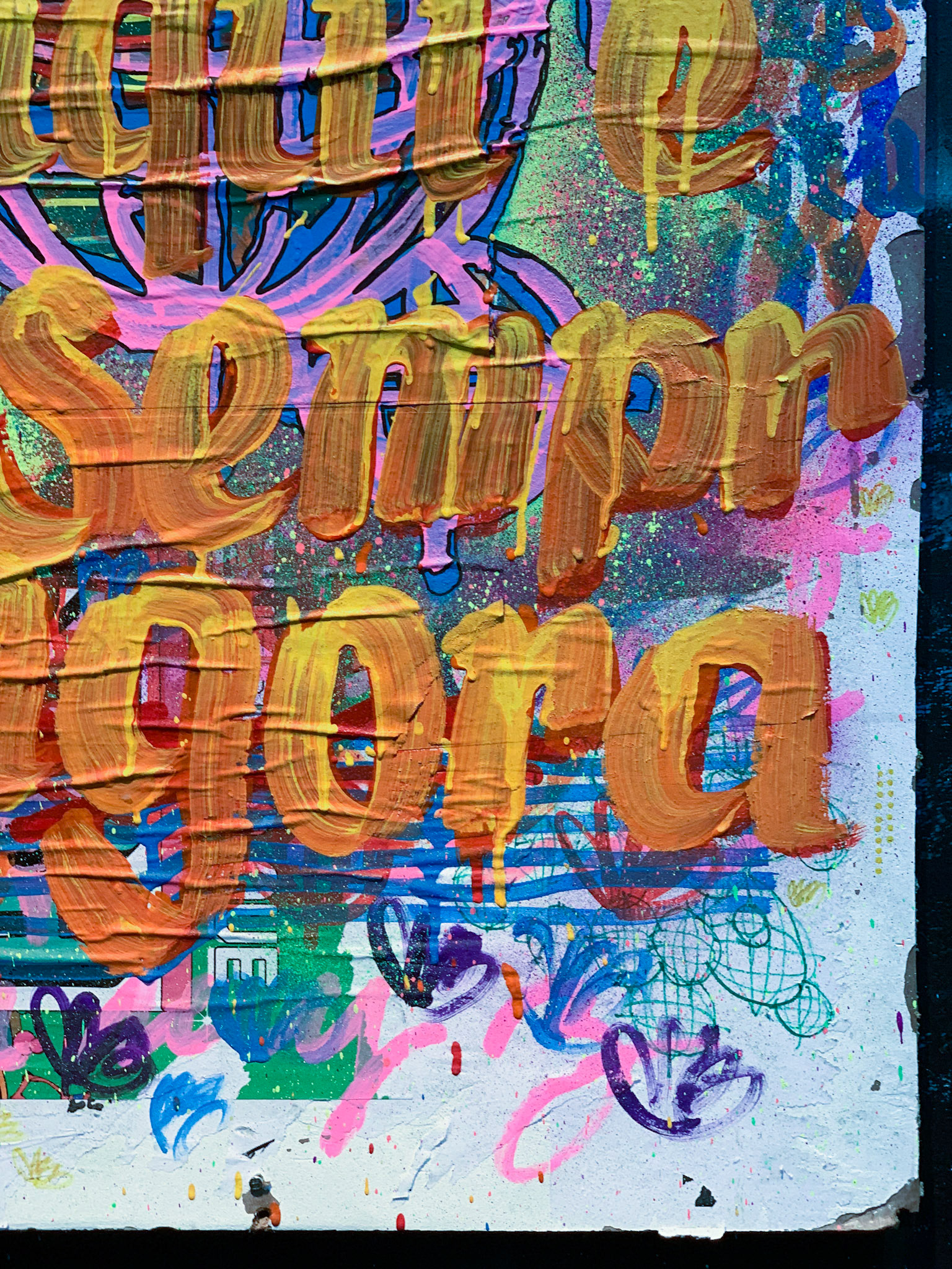 técnica: tinta serigráfica acrílica base água para tecido, spray, giz pastel, tinta de rua, tinta acrilica, grafite sobre eucatex - 63 x 104 cm