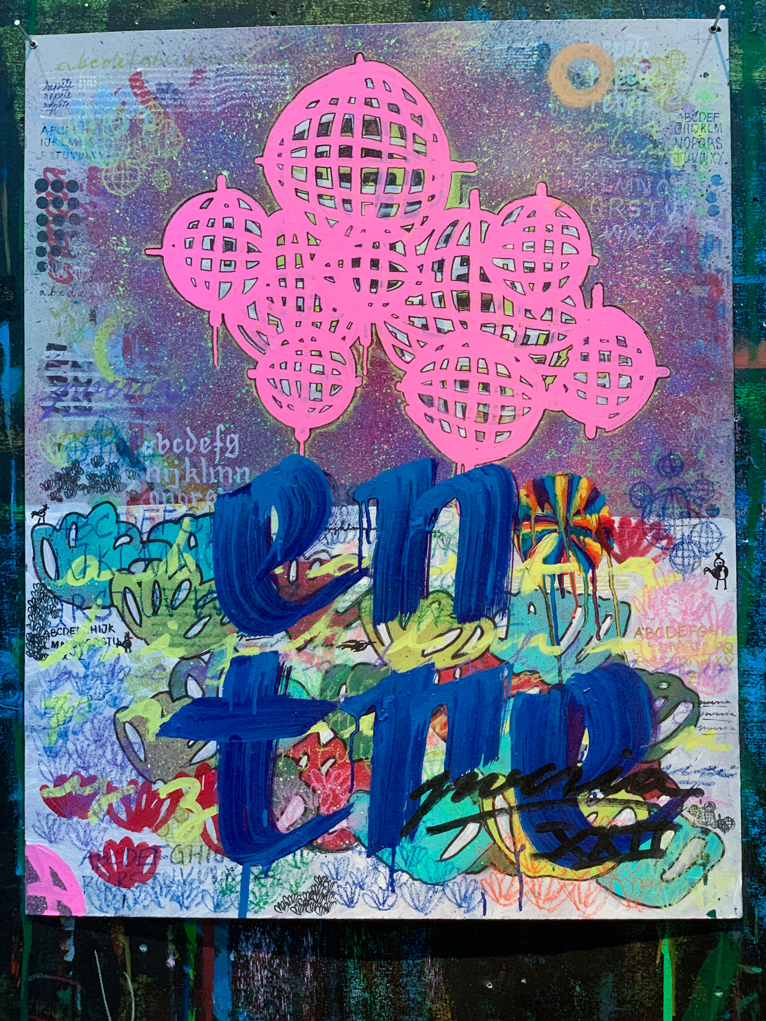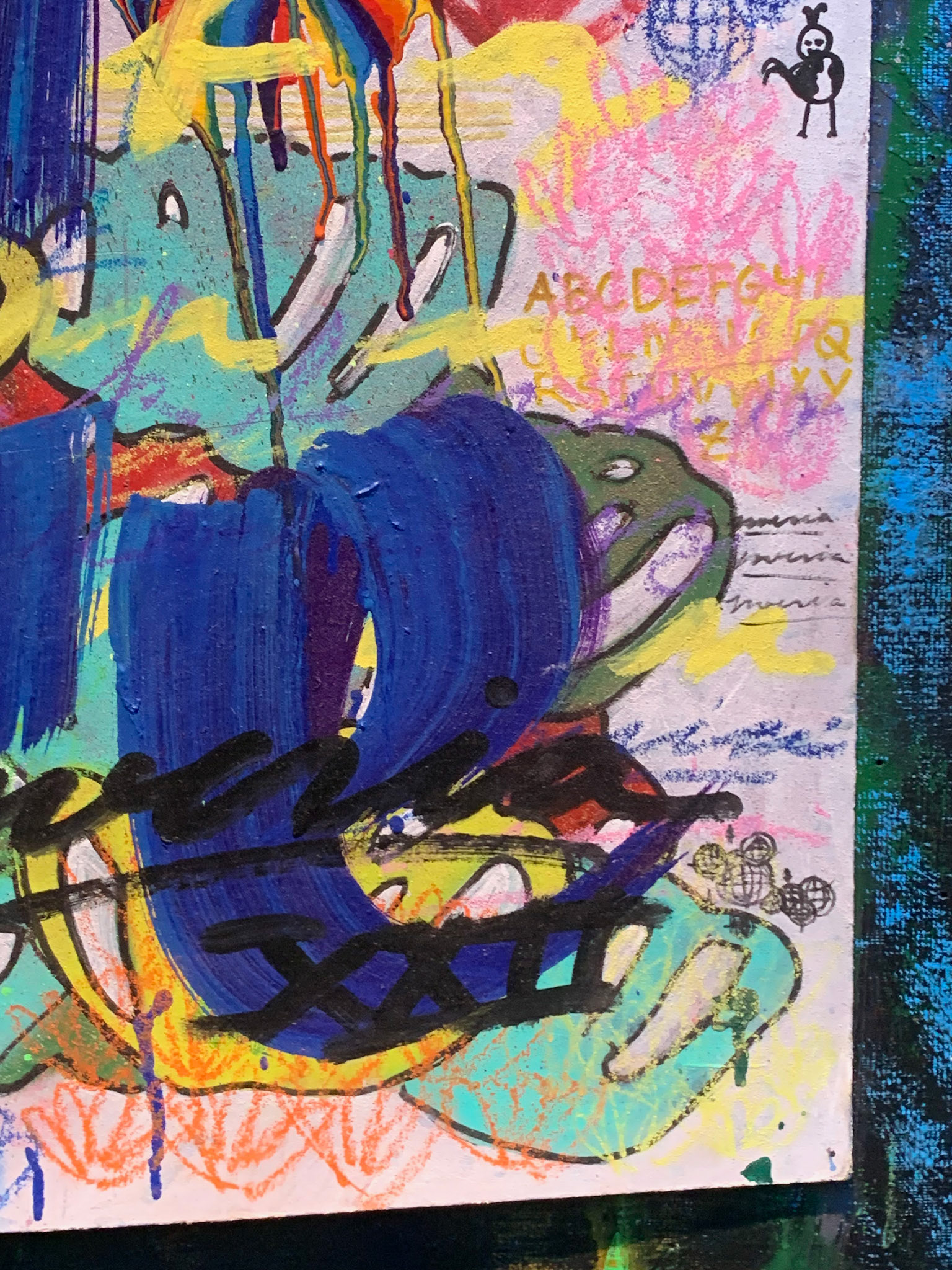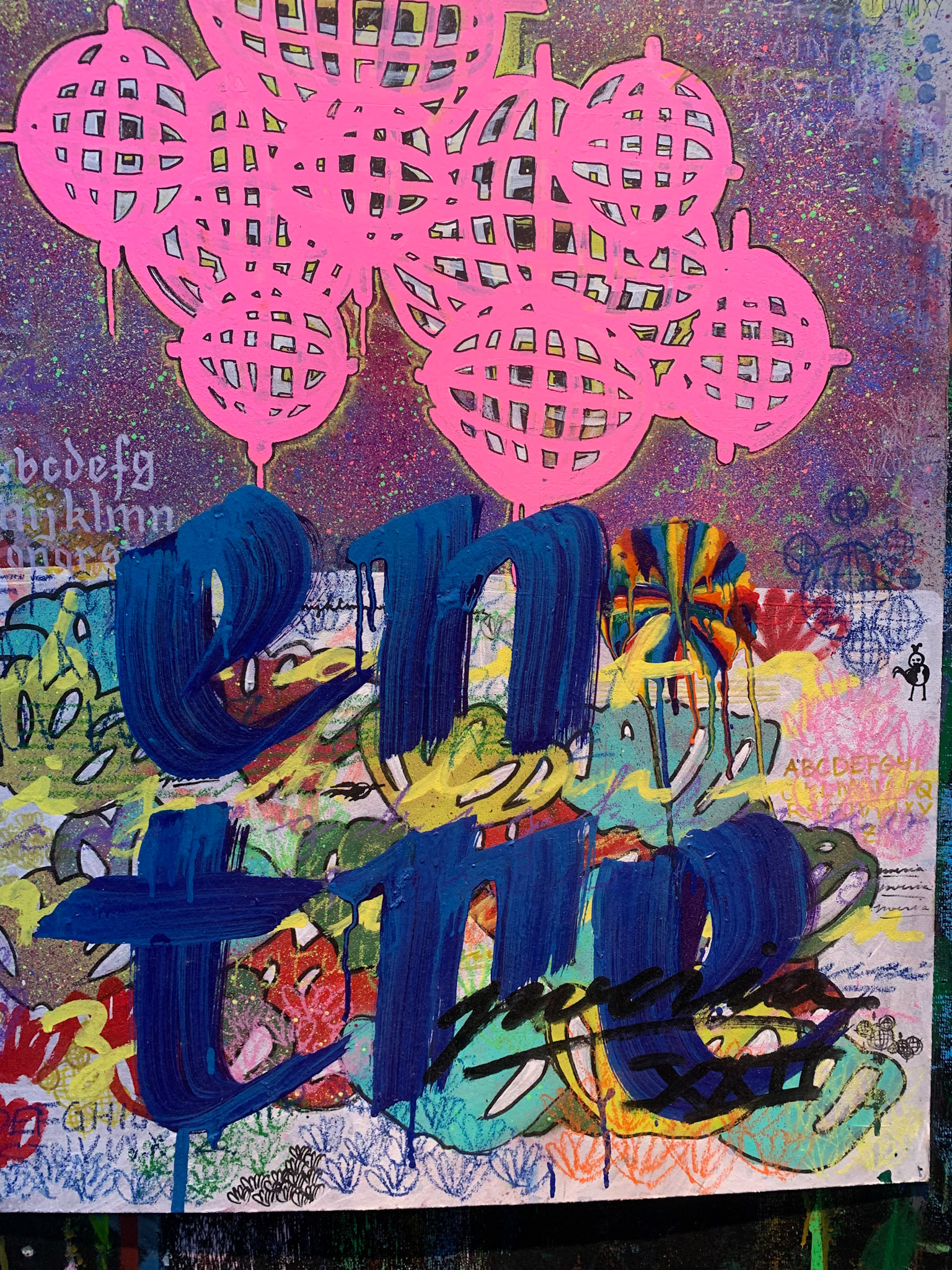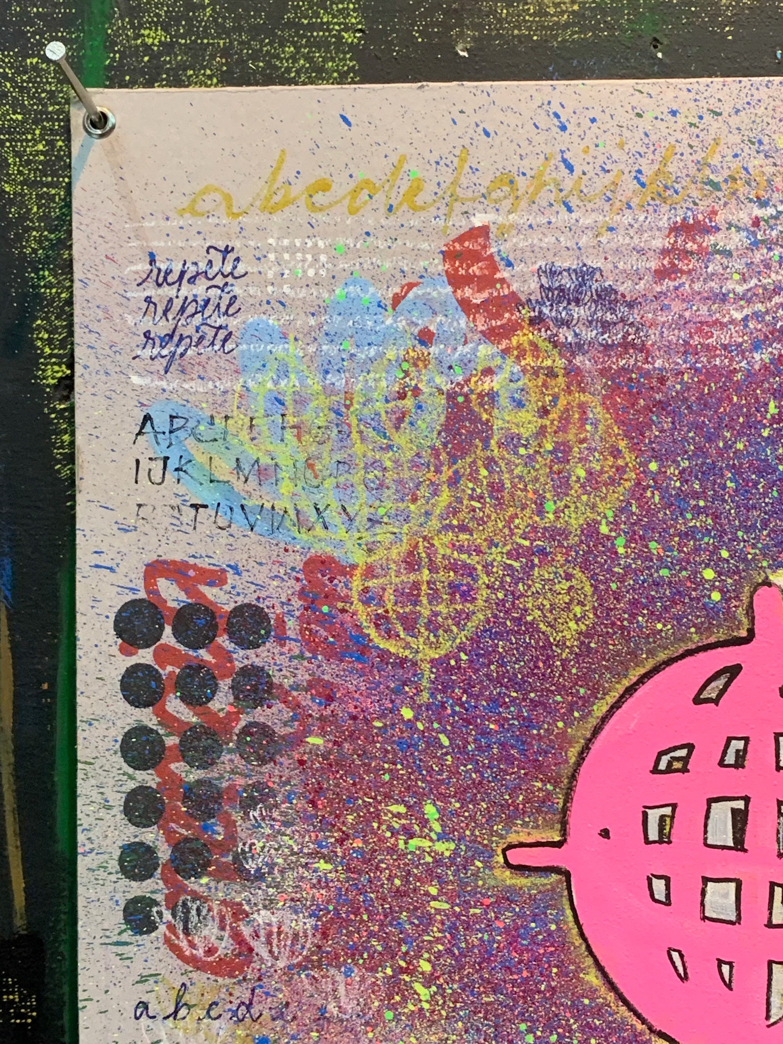 técnica: tinta serigráfica acrílica base água para tecido, spray, giz pastel, tinta de rua, tinta acrilica, grafite e ilhós em papel paraná - 80 x 100 cm