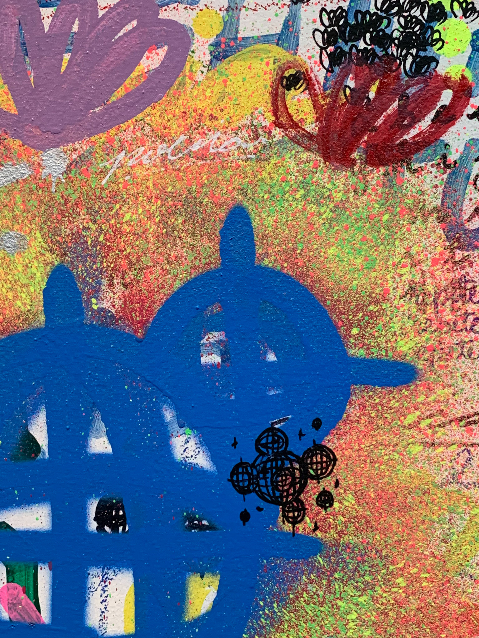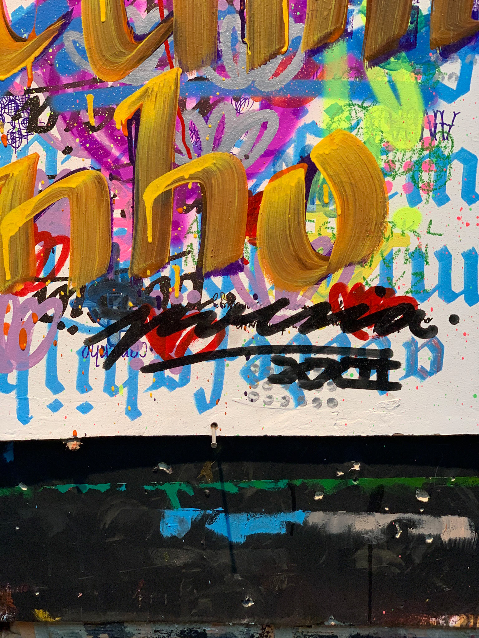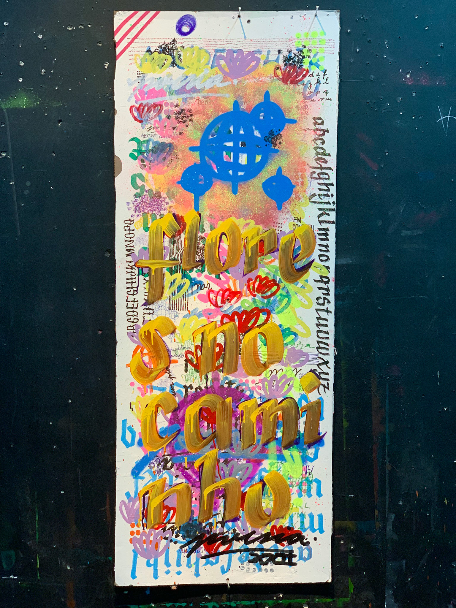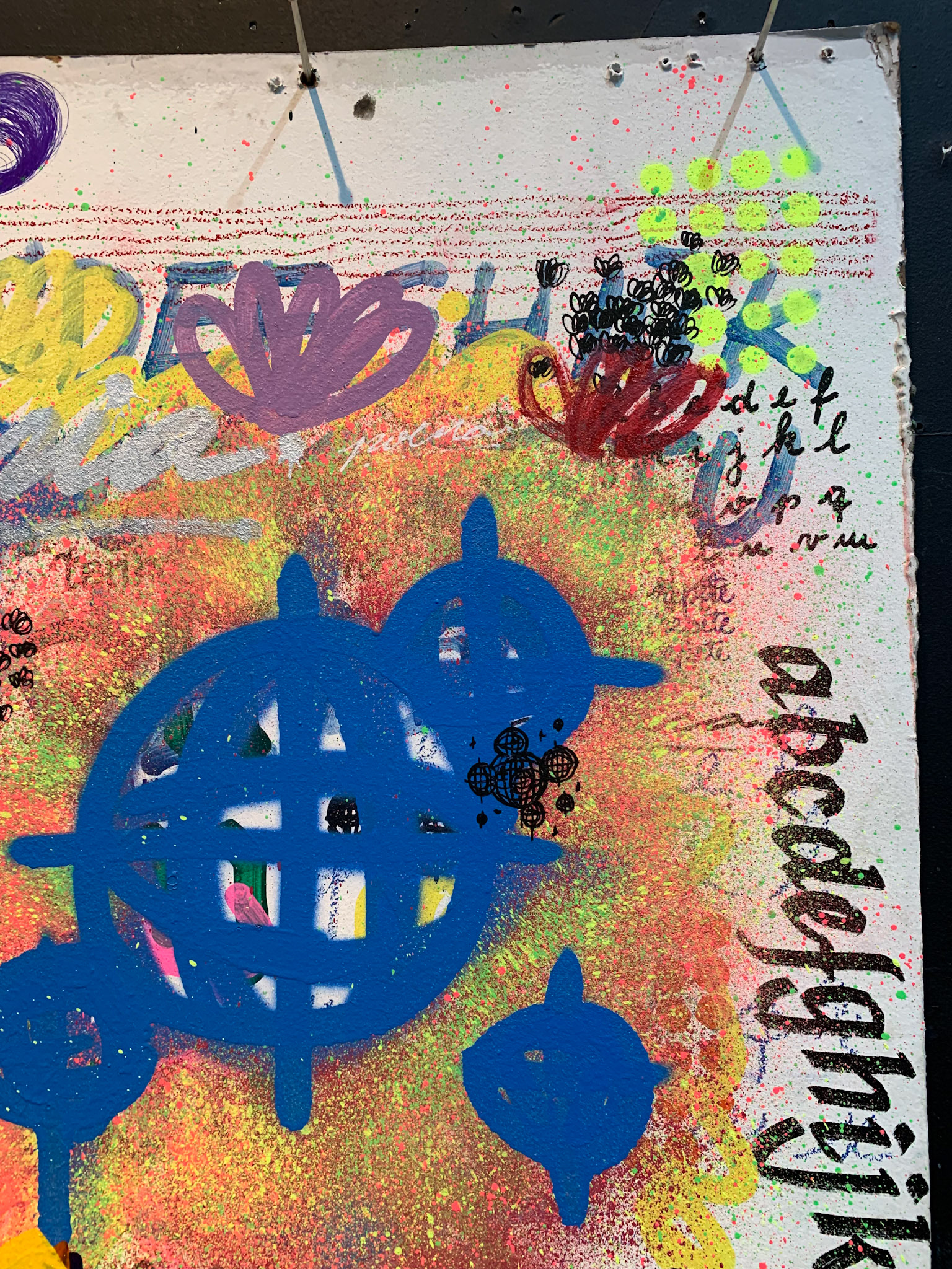 técnica: tinta serigráfica acrílica base água para tecido, spray, giz pastel, tinta de rua, tinta acrilica, grafite sobre eucatex - 62 x 160 cm