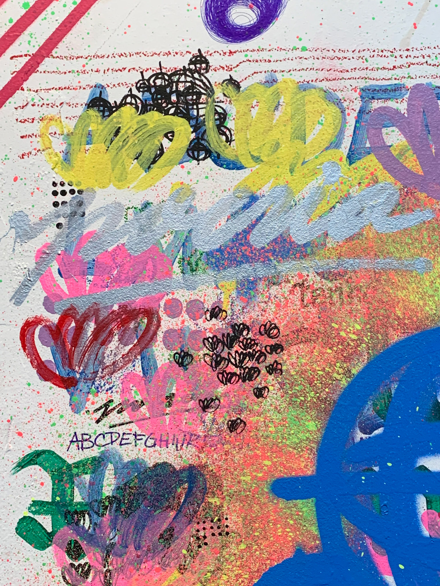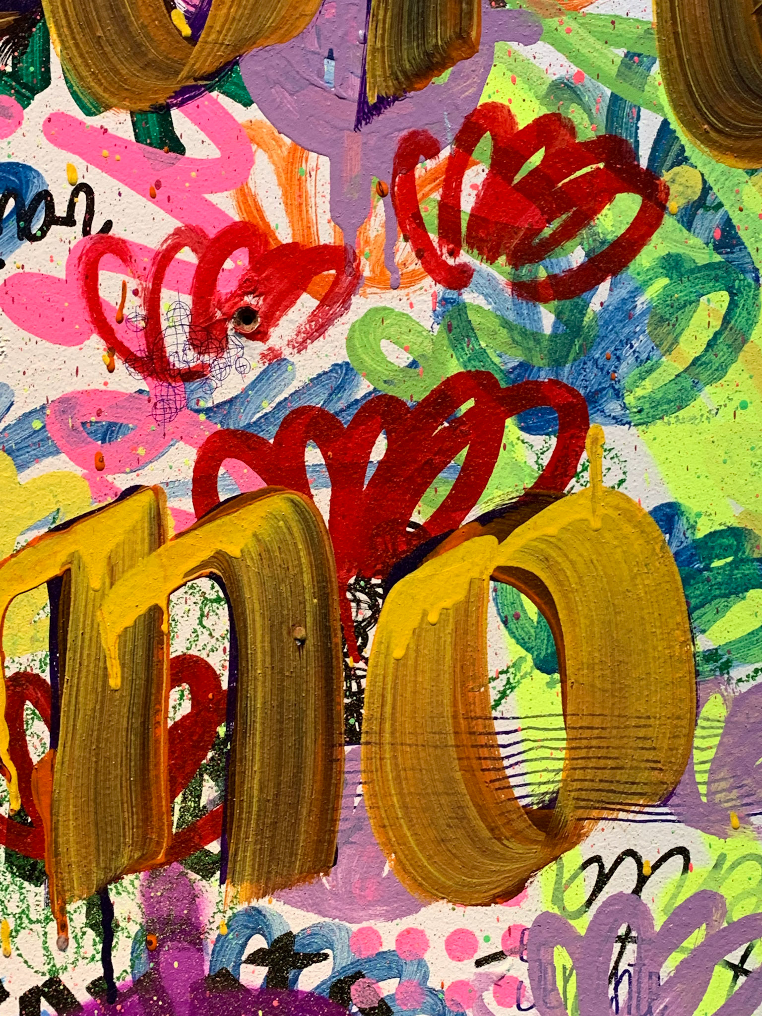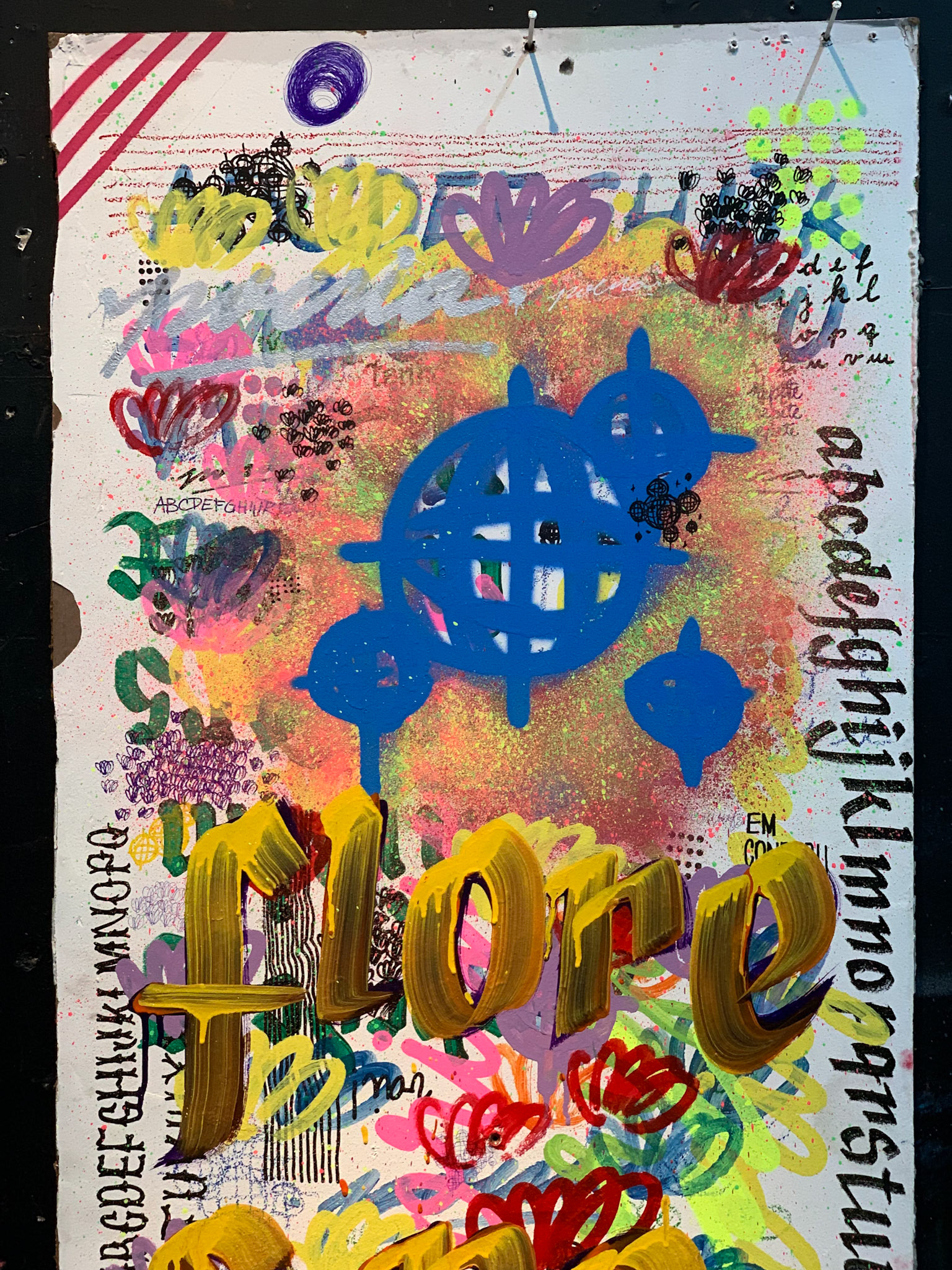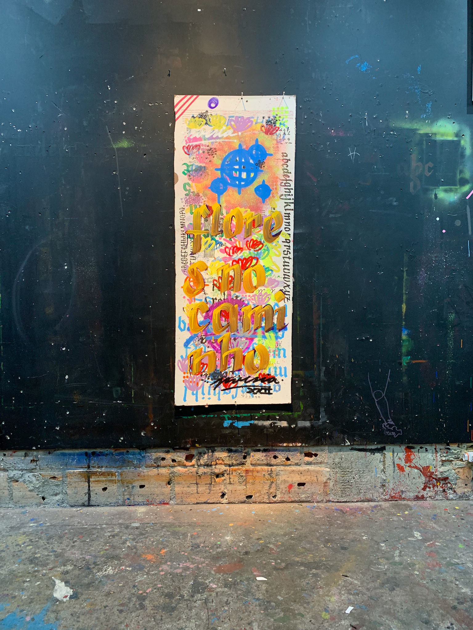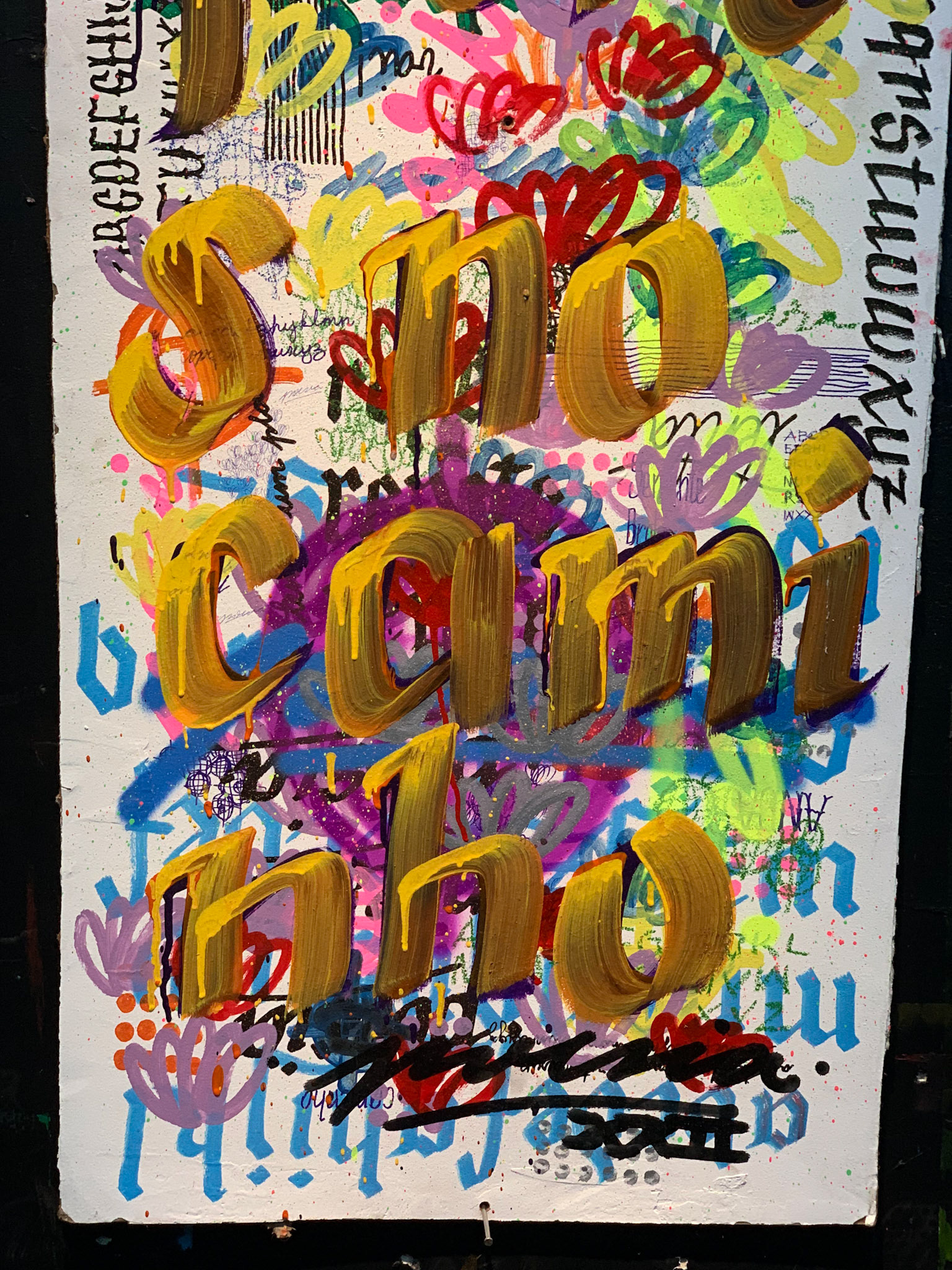 técnica: tinta serigráfica acrílica base água para tecido, spray, giz pastel, tinta de rua, tinta acrilica, grafite sobre eucatex - 62 x 160 cm