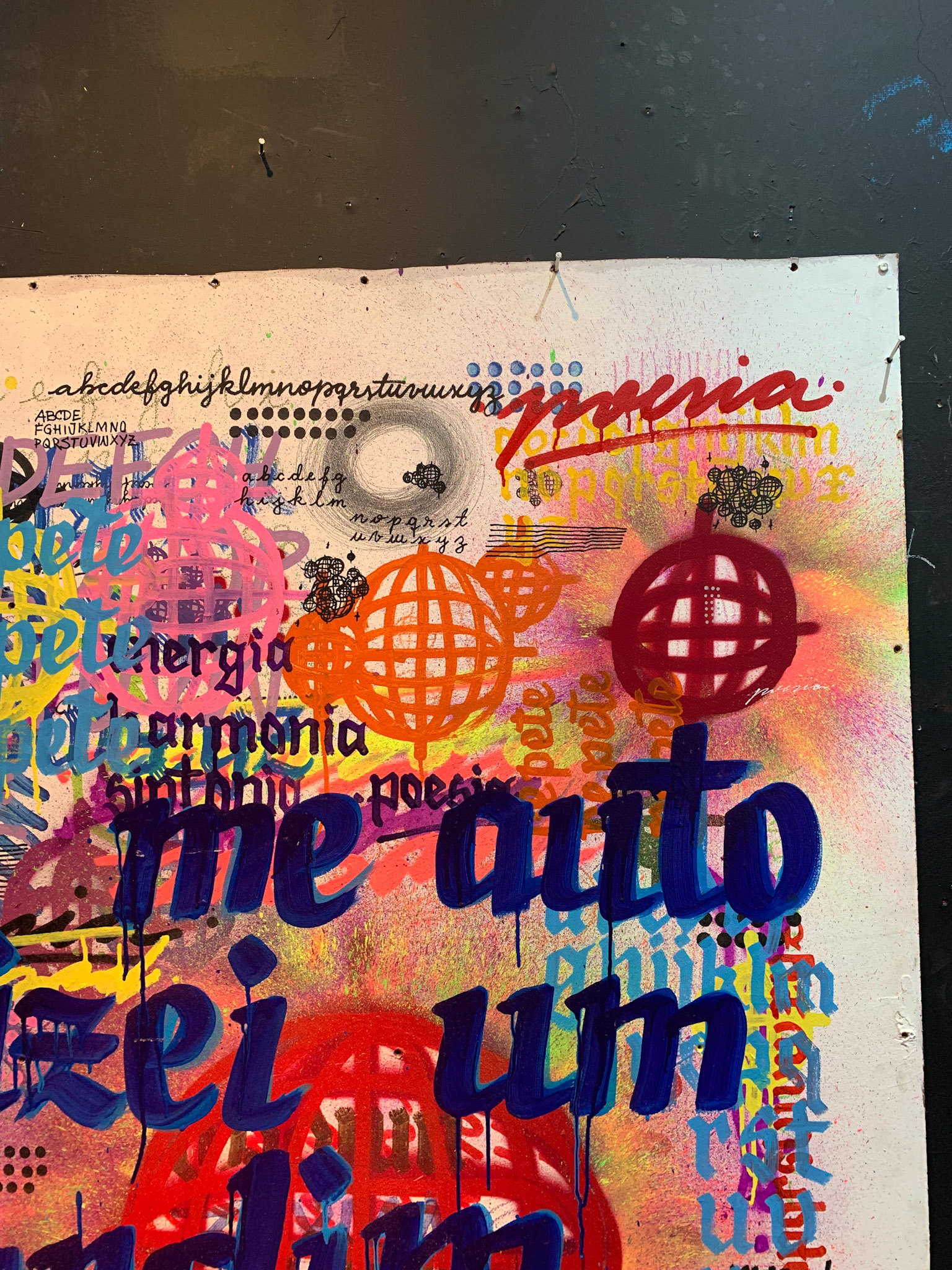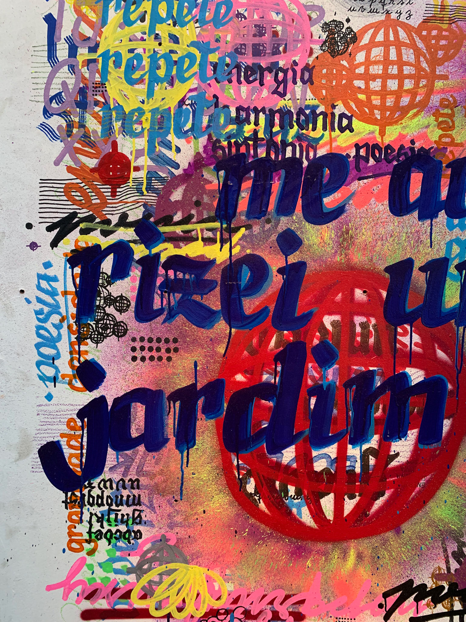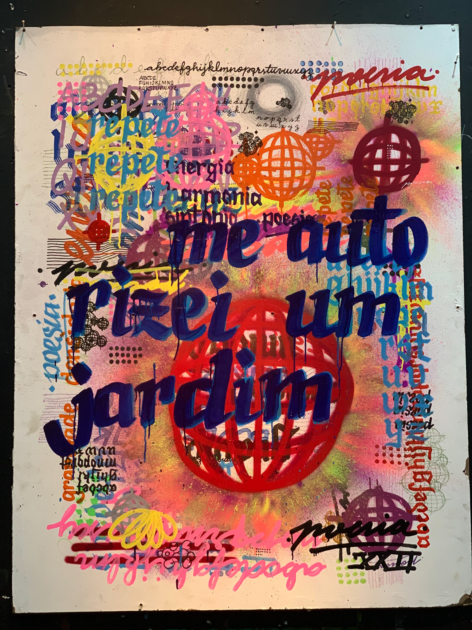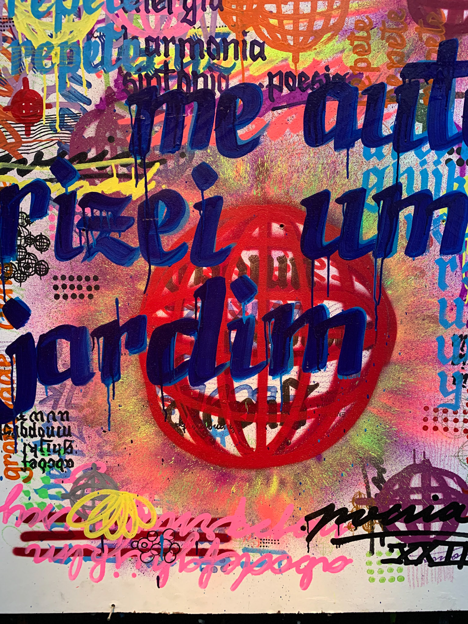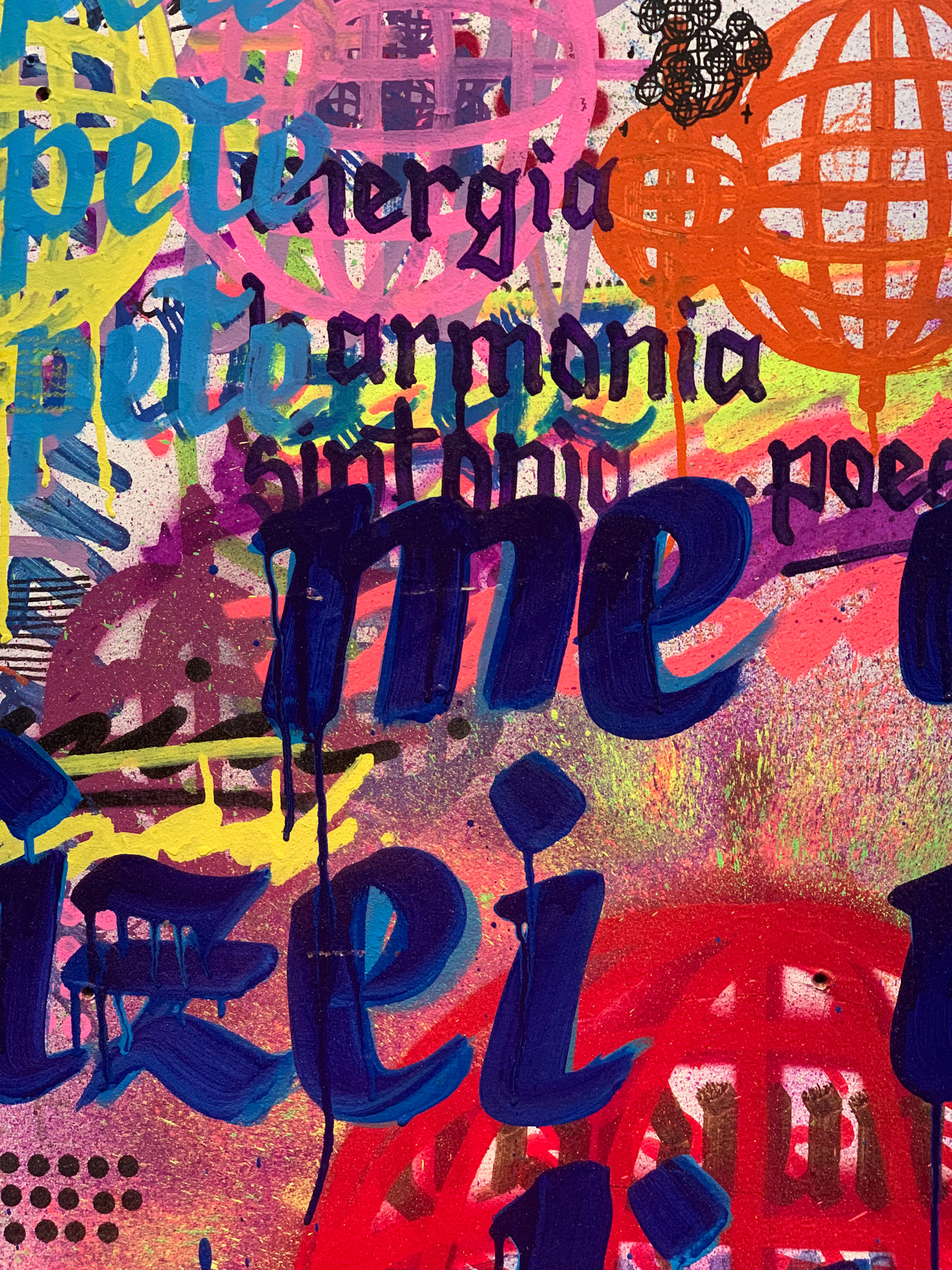 técnica: tinta serigráfica acrílica base água para tecido, spray, giz pastel, tinta de rua, tinta acrilica, grafite sobre eucatex - 122 x 158 cm