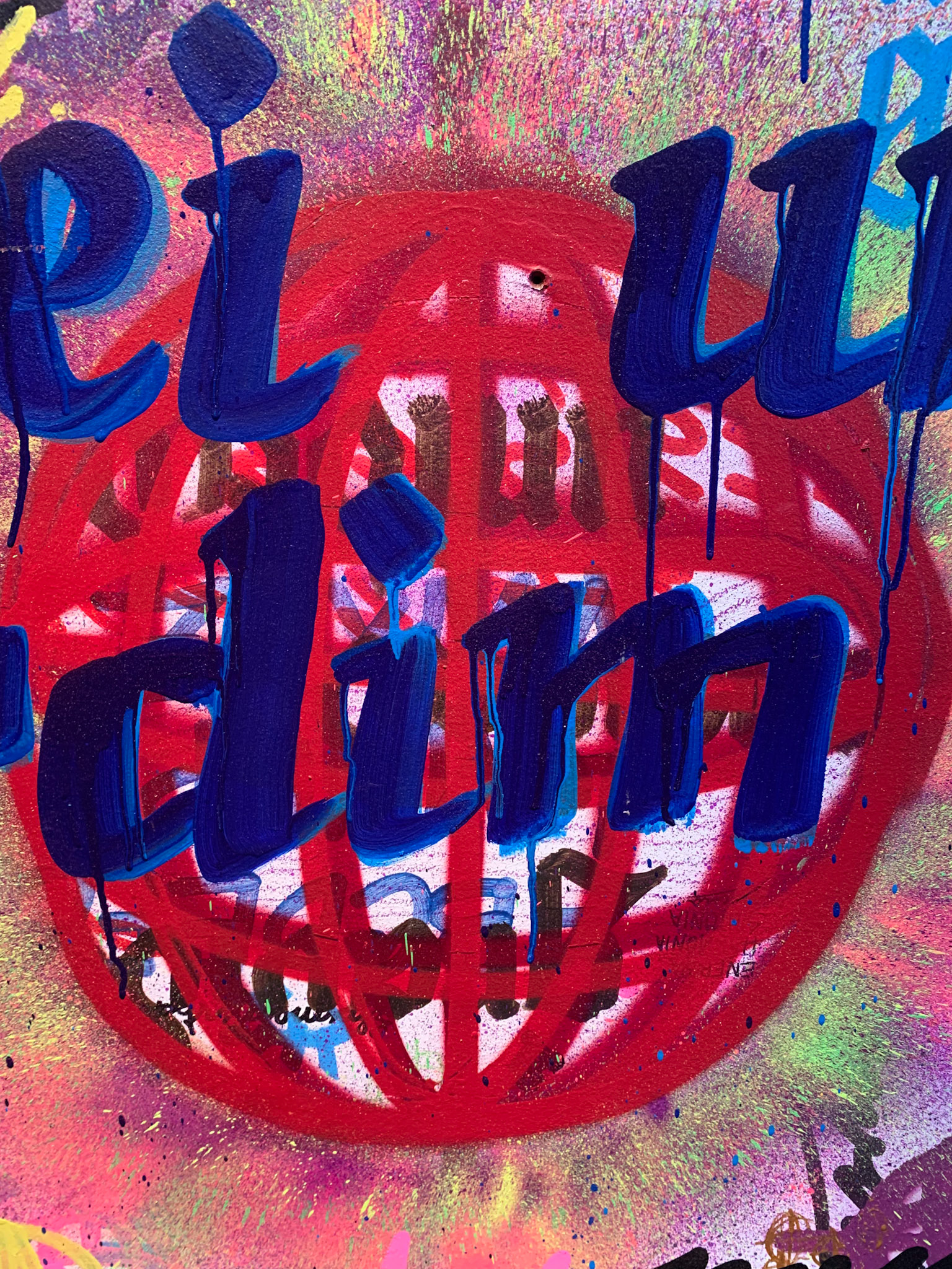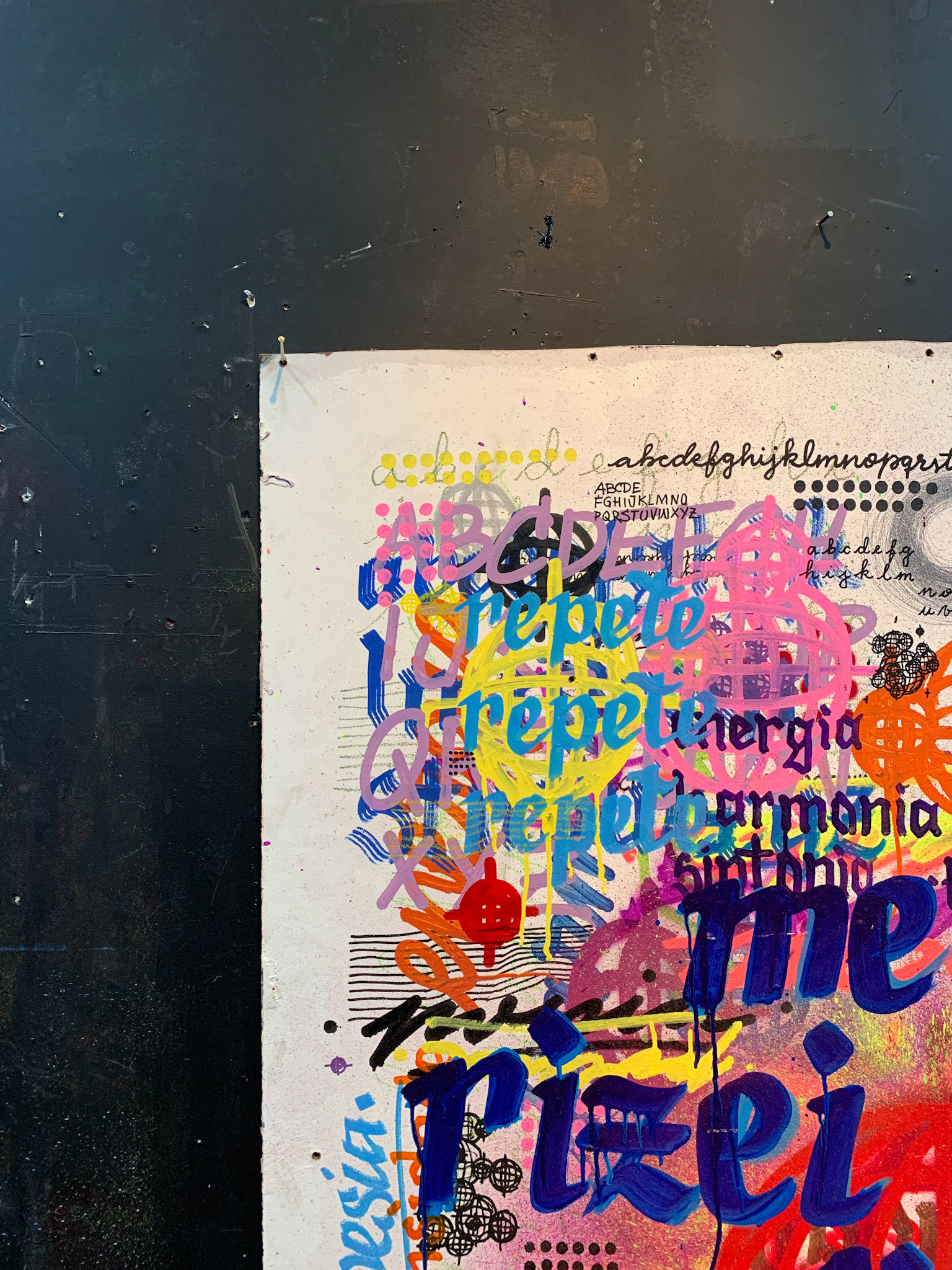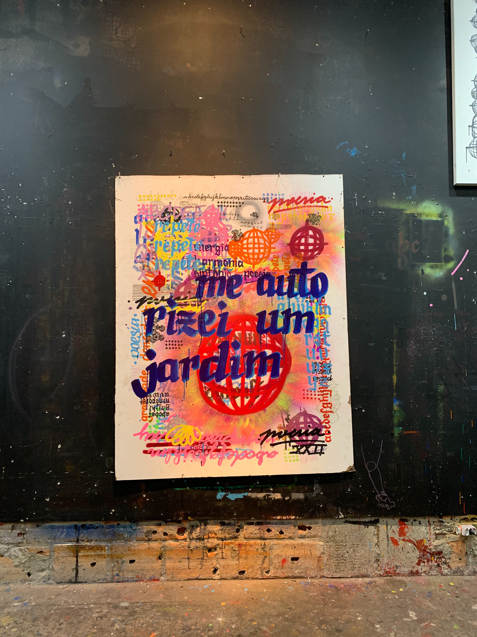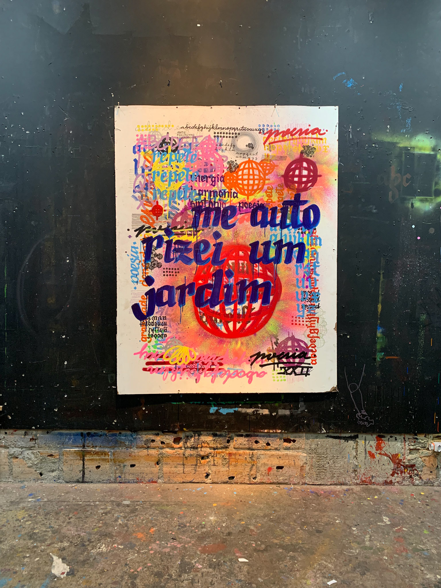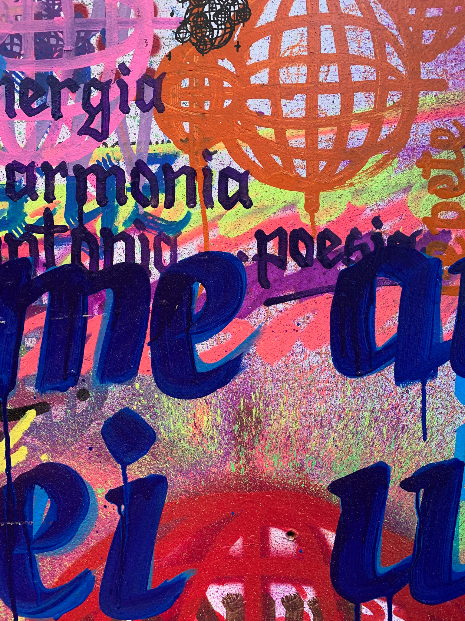 técnica: tinta serigráfica acrílica base água para tecido, spray, giz pastel, tinta de rua, tinta acrilica, grafite sobre eucatex - 122 x 158 cm