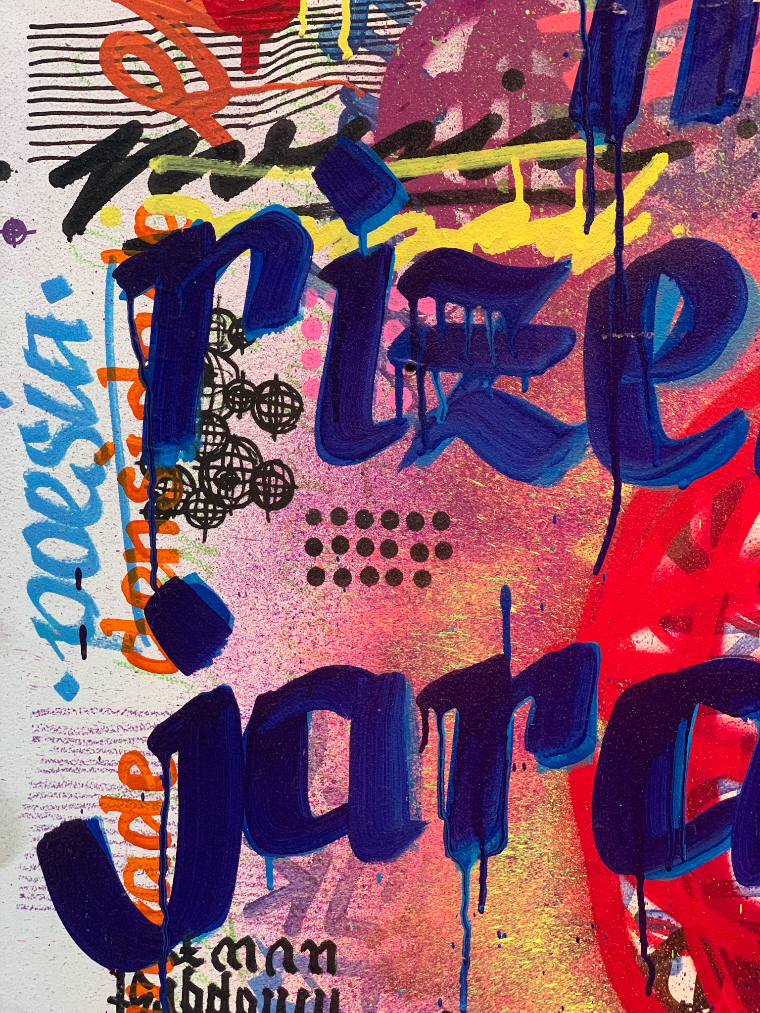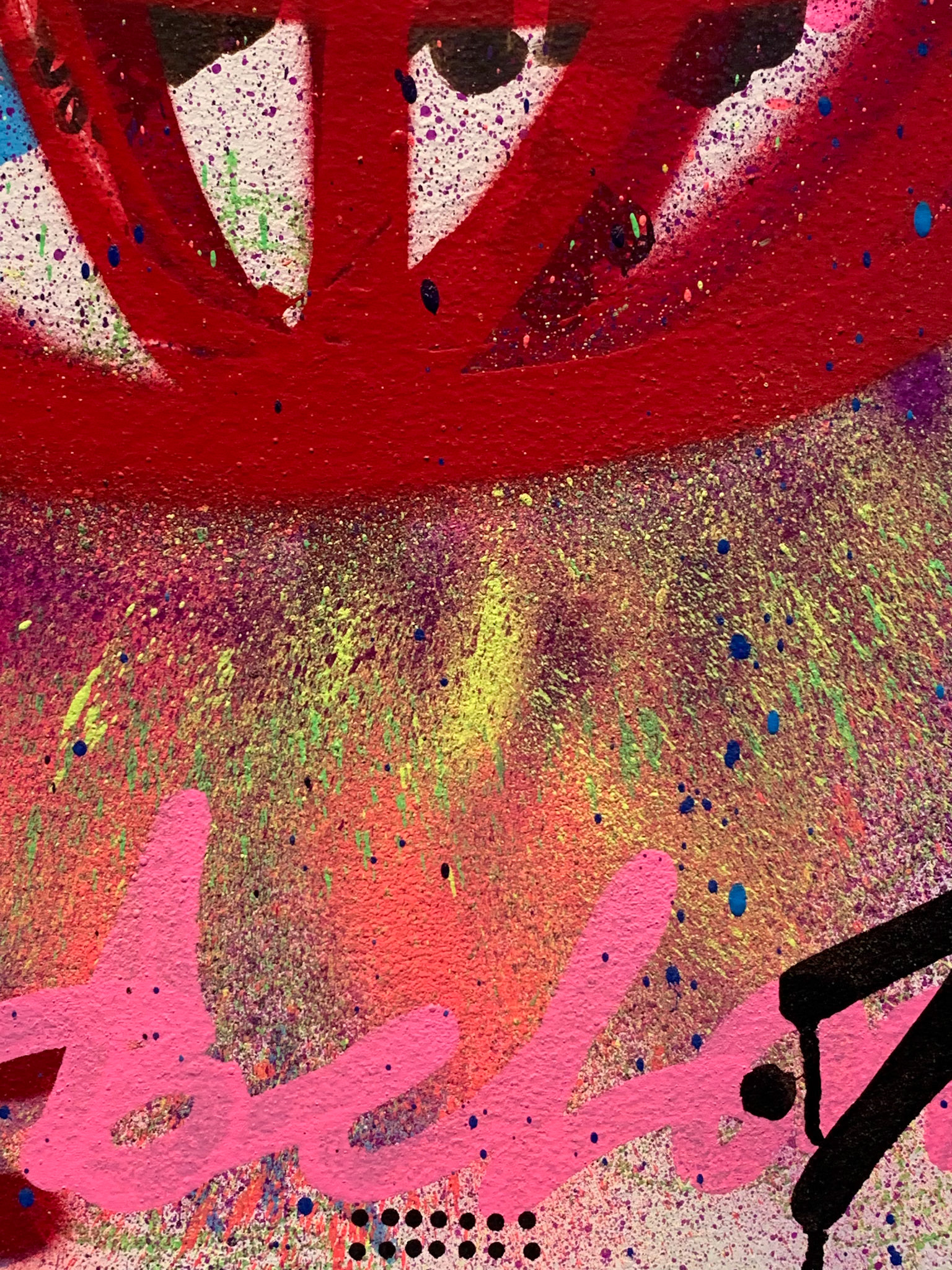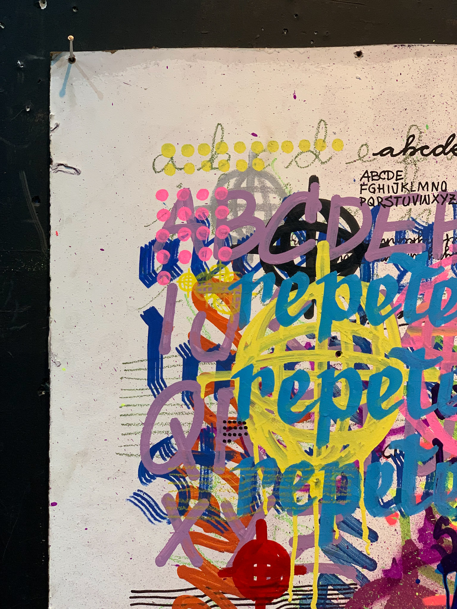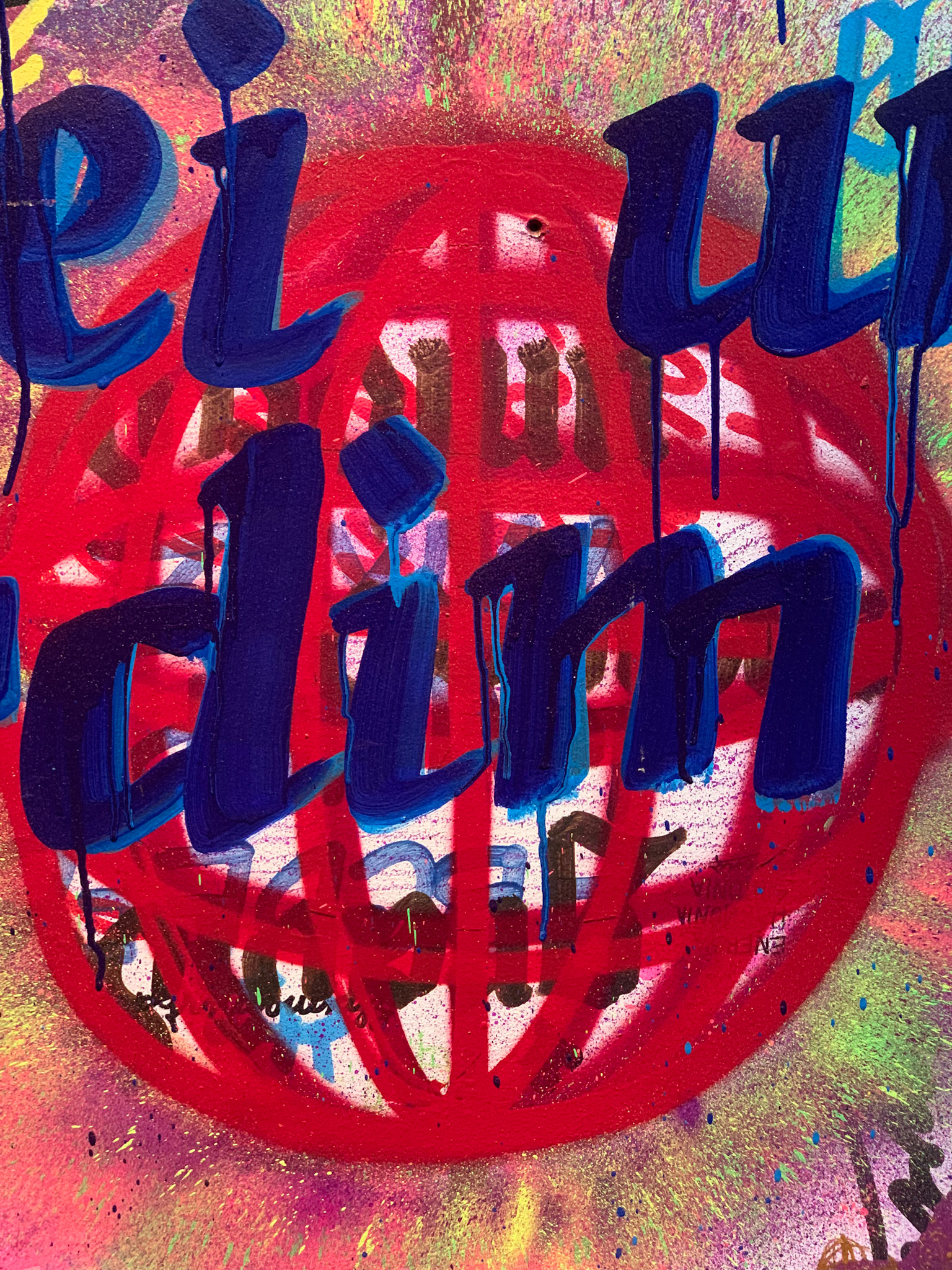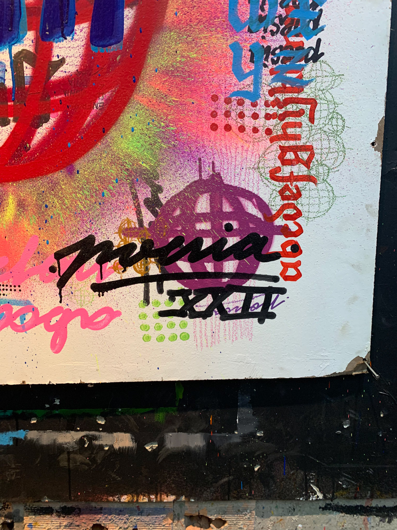 técnica: tinta serigráfica acrílica base água para tecido, spray, giz pastel, tinta de rua, tinta acrilica, grafite sobre eucatex - 122 x 158 cm