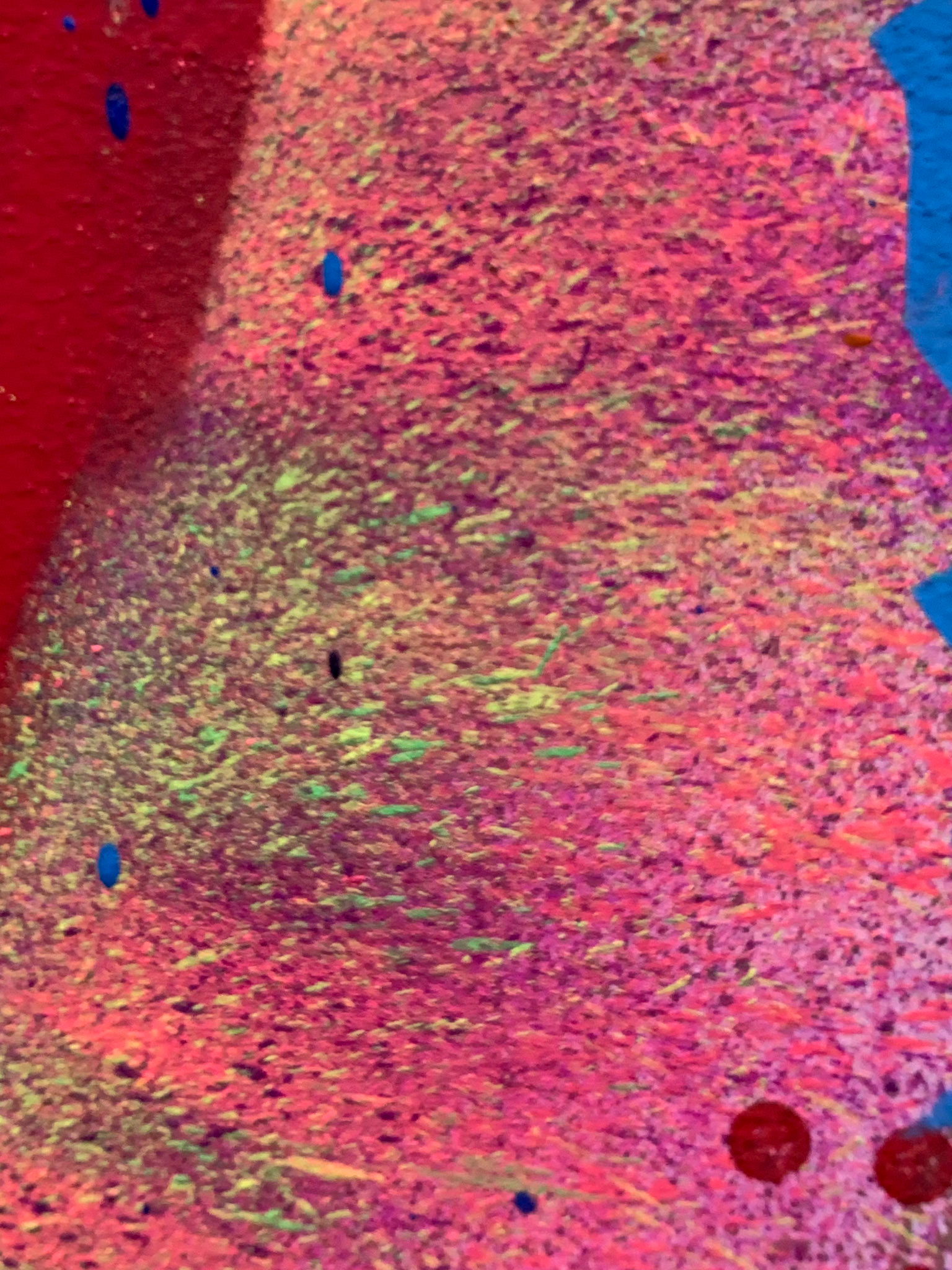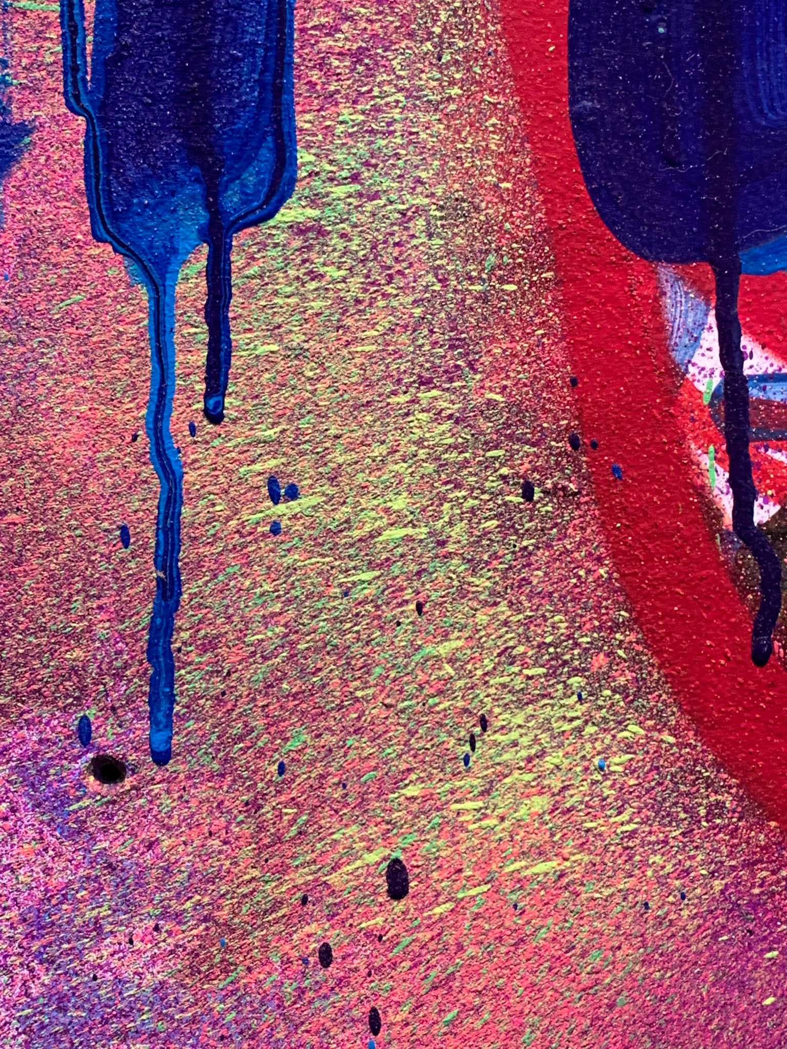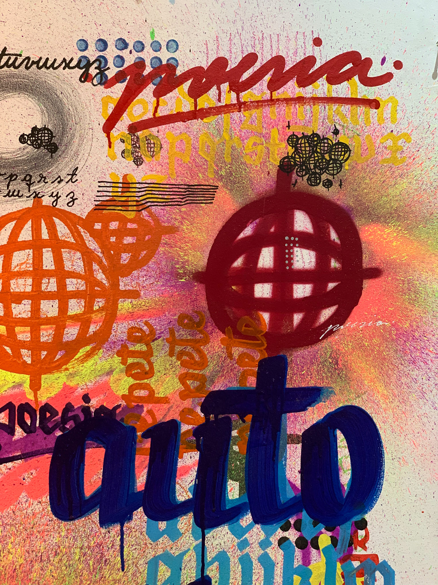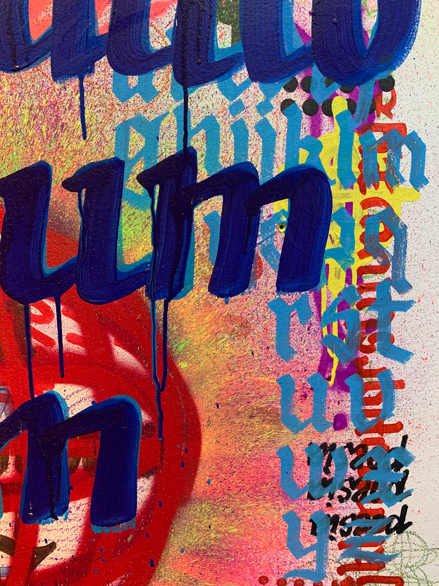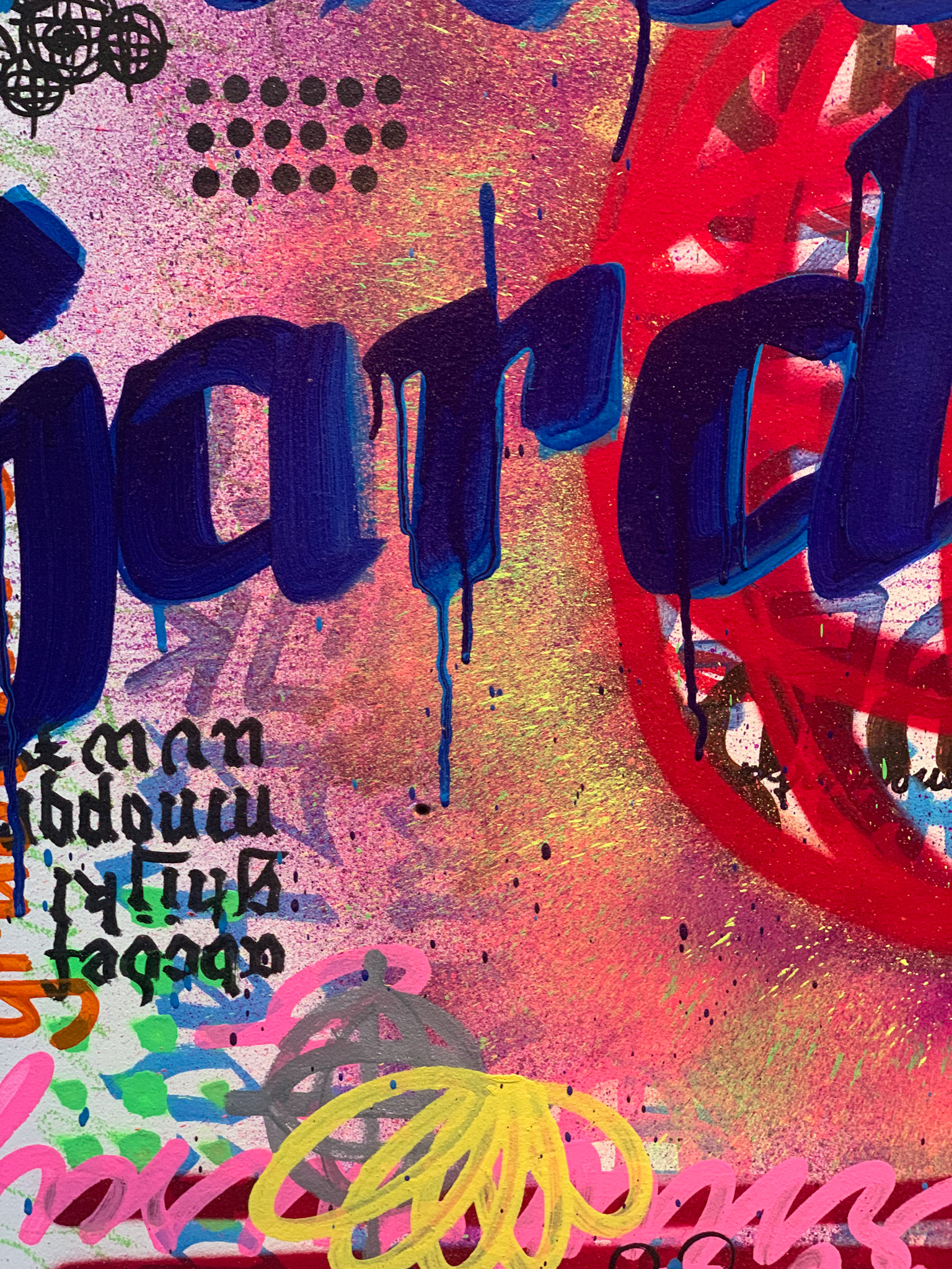 técnica: tinta serigráfica acrílica base água para tecido, spray, giz pastel, tinta de rua, tinta acrilica, grafite sobre eucatex - 122 x 158 cm